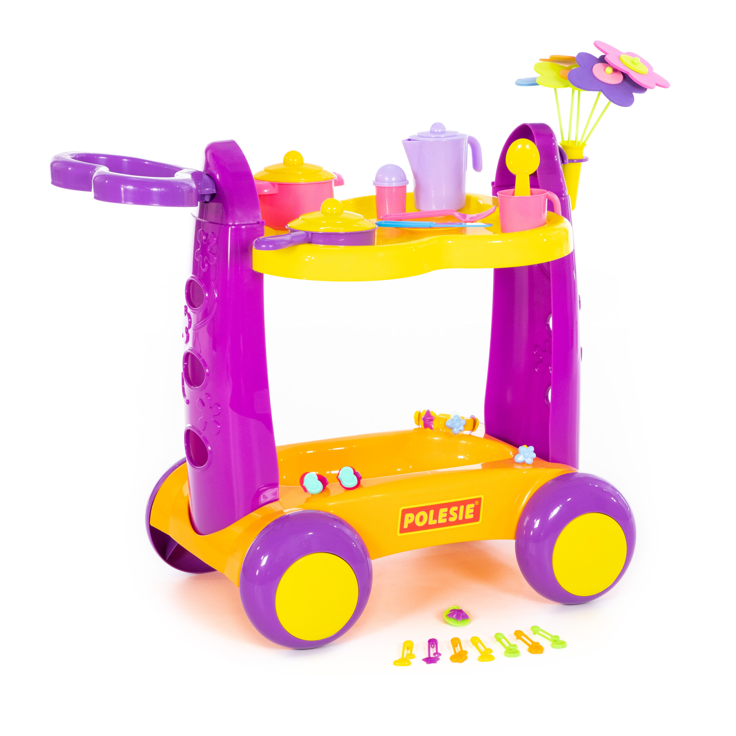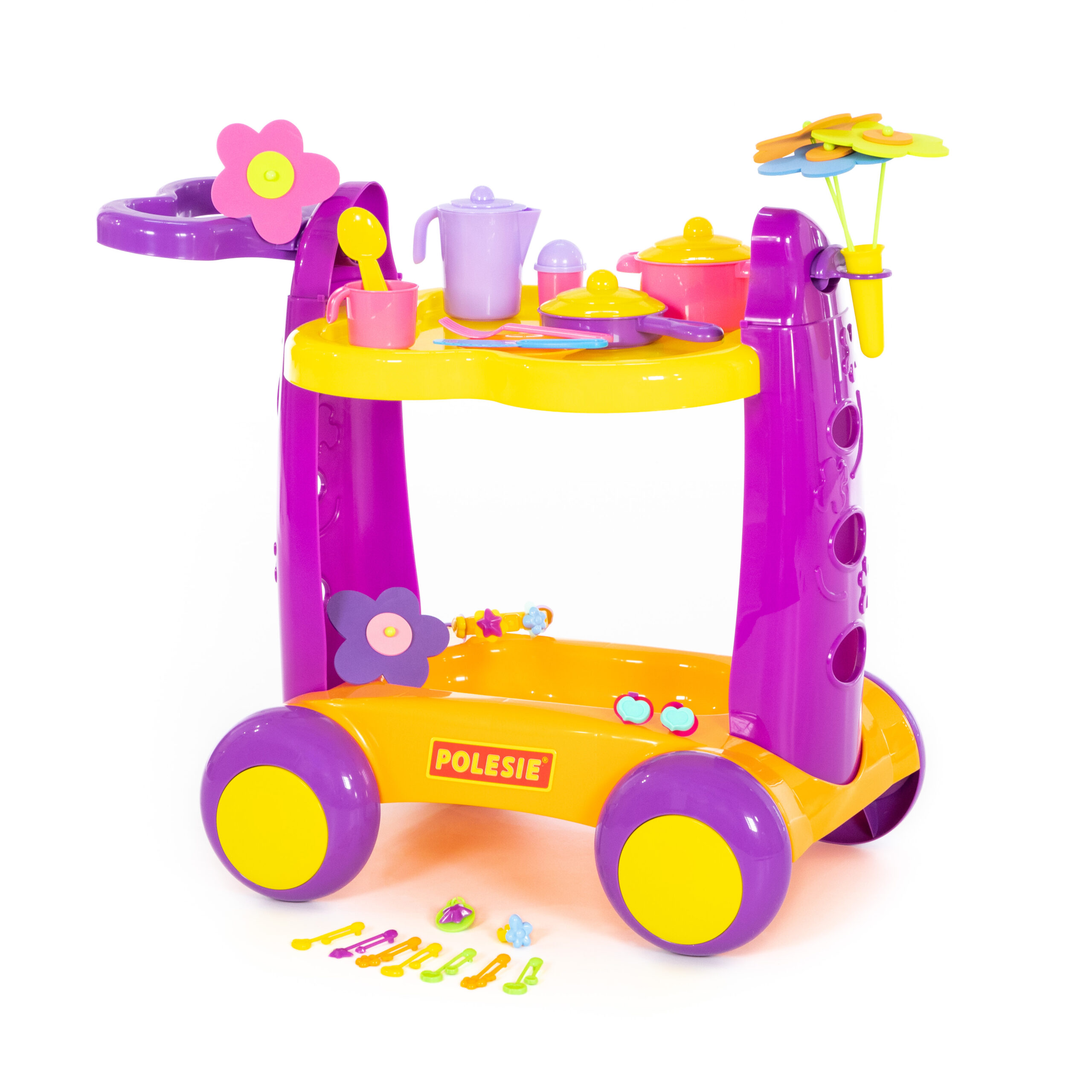 С тази количка малките домакини могат да сервират, „готвят“ и да се забавляват часове наред, у дома или с приятели.