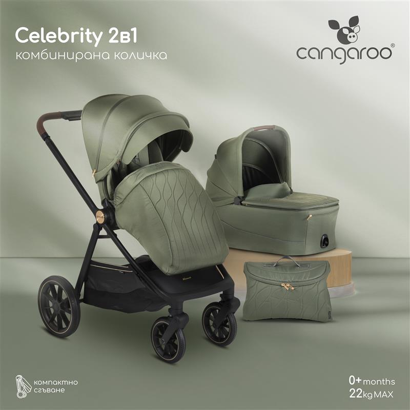 Комбинирана количка 2 в 1 Celebrity, Cangaroo, създадена с мисъл за динамичното ежедневие на родителите и пълния комфорт на детето. Подходяща за деца от раждането до 4 години (или до 22 кг). Сгъва се лесно, управлява се леко и предлага множество удобства – както за града, така и за разходки извън него.