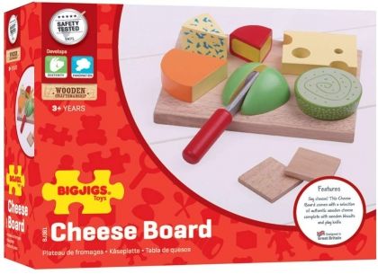 Дъската със сирена на Bigjigs е чудесен комплект, който ще запознае децата не само с различните видове сирена и цветове, но и с балансираното хранене. Ябълката е подходяща за разрязване с дървения нож в комплекта, тъй като двете ѝ части са свързани с велкро лепенки. Изработката на частите е от дървесина, а боите са на водна основа.