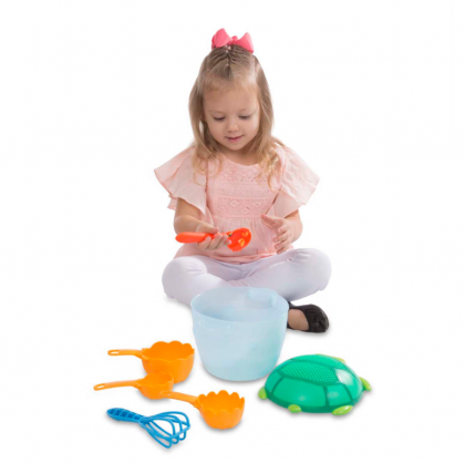 - Тенджера с капак – сито: Тенджерата може да се използва като сито за прецеждане на пясък или за съхранение на съставки, което дава възможност на детето да се забавлява и в същото време да учи за различните кухненски инструменти.