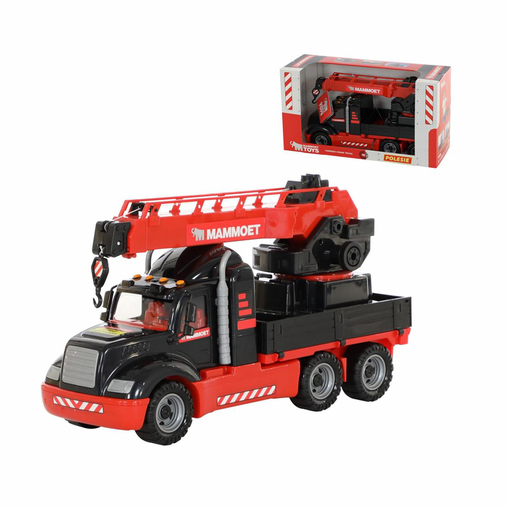 Оборудван с подвижен кран, имитация на стъклени прозорци и въртящи се колела.