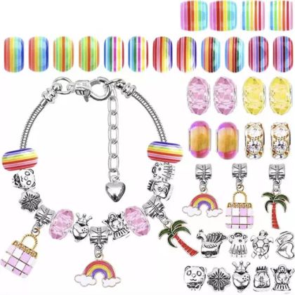Целият комплект е опакован в удобна кутия, която улеснява съхранението и транспортирането. Кутията е достатъчно малка, за да може да бъде поставена в шкафче или да се носи навсякъде, без да заема много място. Това прави съхранението на мънистата и висулките удобно и организирано. Детето ще може лесно да намери нужните части, когато реши да създаде ново бижу, и няма да има проблеми със загубата на елементи.