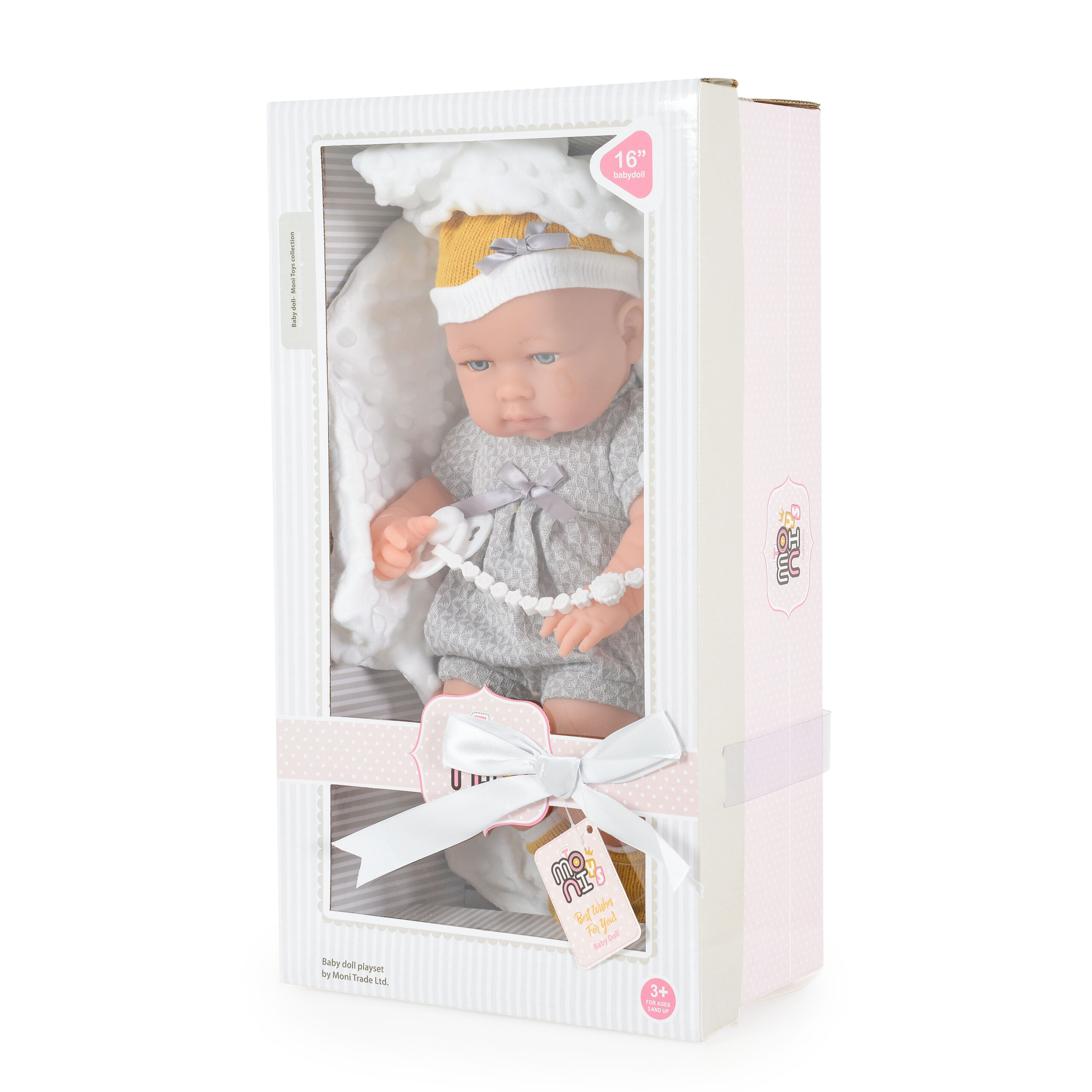 В комплектчето са включени: биберон и меко одеалце, с което детенцето да завива куклата – бебе. Докато се забавлява със своя нов приятел, Вашият малчуган ще развива своите социални умения, ще се учи да бъде грижовен и внимателен.