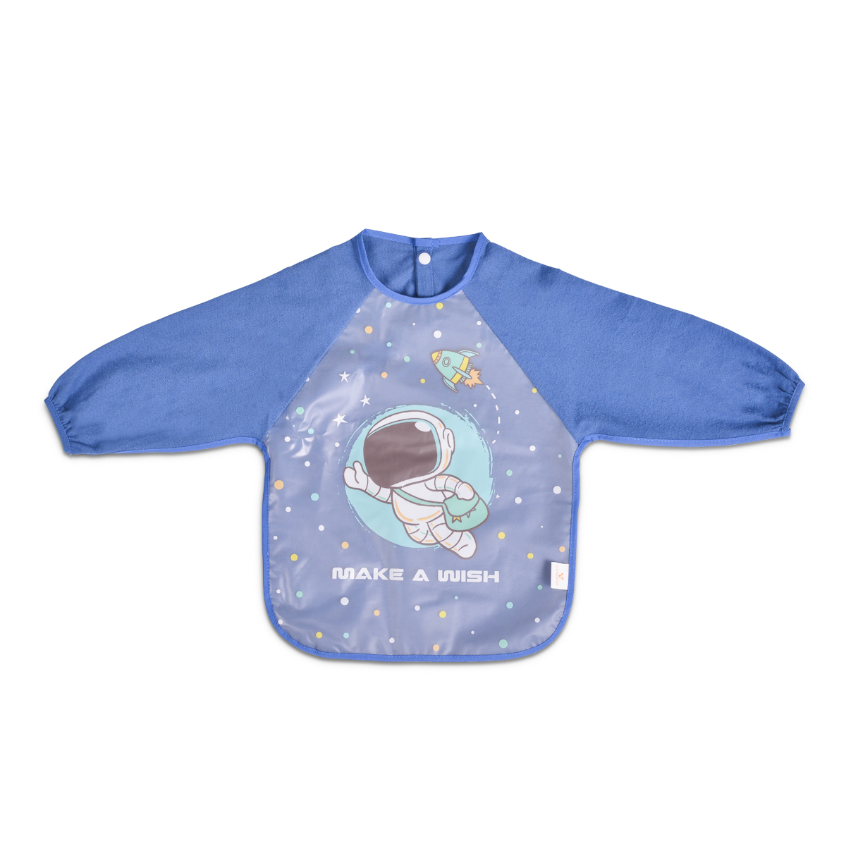 Детски лигавник с ръкави Tea Time е подходящ за деца над 6 месеца и е с практичен дизайн, с ръкави, за да предпазва дрехите на детето сухи и чисти по време на хранене или игра. Изработен е от 100% памучен плат и горен слой водоустойчив материал, който не задържа петна и се пичства лесно. Закопчава се удобно, осигурявайки комфорт и защита.