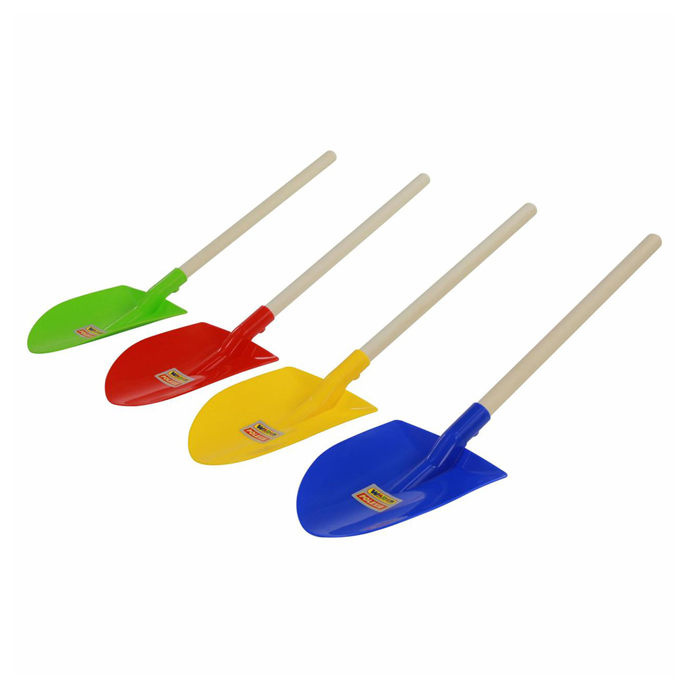 Детска играчка лопата с дървена дръжка – здрава и удобна, подходяща за игра в пясъка, снега или градината. Изработена от леко пластмасово гребло и стабилна дървена дръжка. Предлага се в четири ярки цвята – зелено, червено, жълто и синьо.
