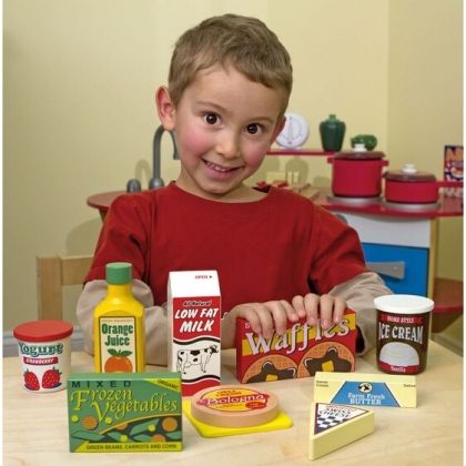 С комплекта хранителни стоки от Melissa & Doug, вашето дете ще се потопи в света на ролевите игри и ще развива своето въображение, докато се запознава с различни хранителни продукти. Комплектът съдържа девет дървени продукта, които децата могат да поставят в хладилника и фризера си, създавайки собствени кулинарни приключения. Продуктите в комплекта включват портокалов сок, гофрети, мляко, сладолед, сирене, кисело мляко, салам, замразени зеленчуци и масло.