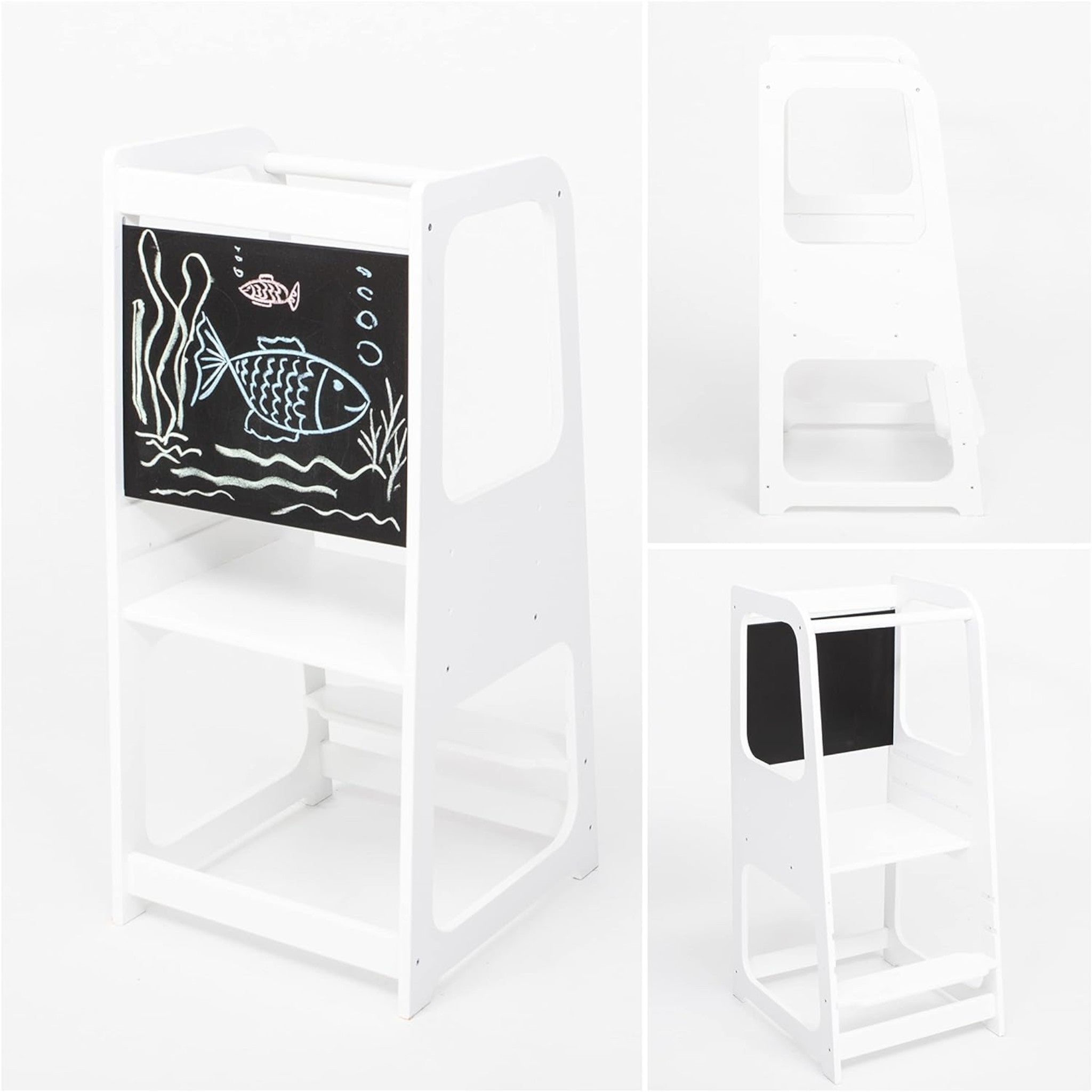 Монтесори Кула GINGER HOME, Образователно Столче с Черна Дъска и Регулируема Височина, Бяла, за Деца от 1-4 години