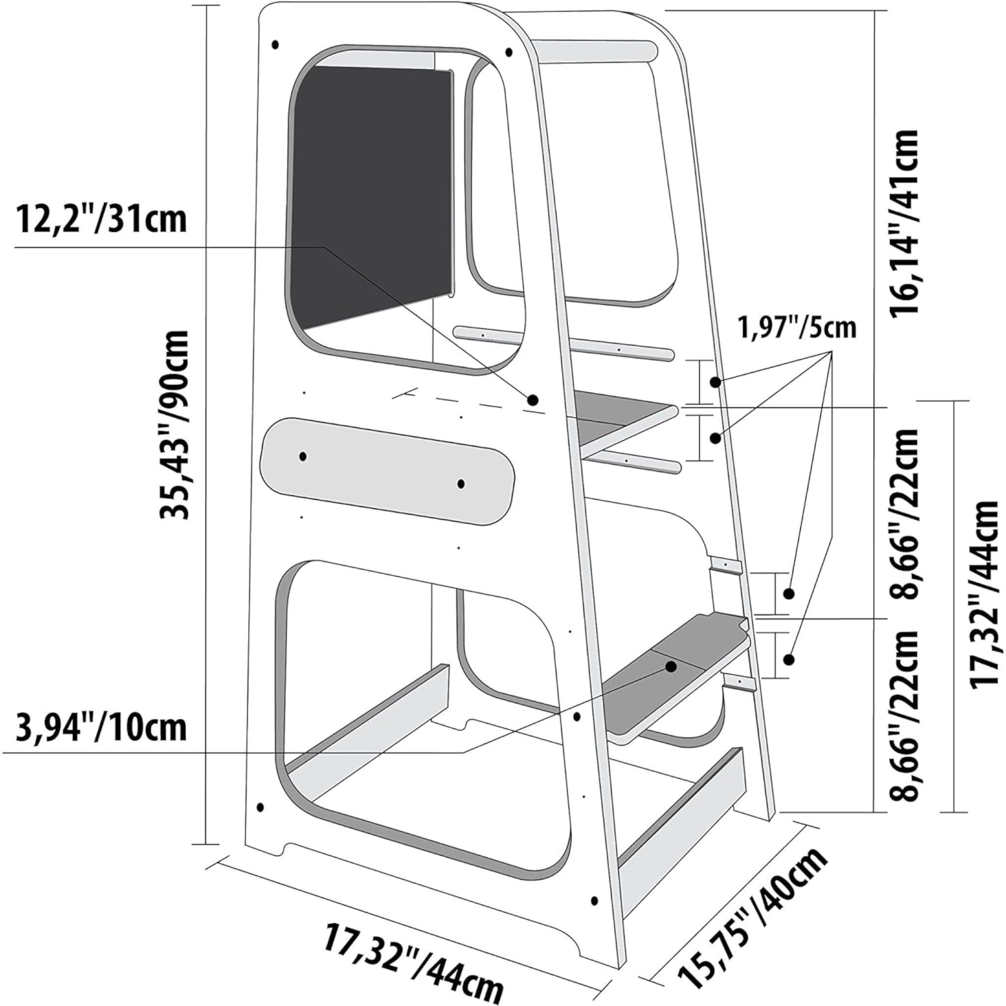 - Регулируемата височина позволява лесно приспособяване към ръста на детето, осигурявайки комфорт и сигурност по време на използване. Кулата е снабдена с черна дъска, която предоставя възможност за рисуване и писане с тебешир, стимулирайки творческото мислене и учебните дейности на детето.