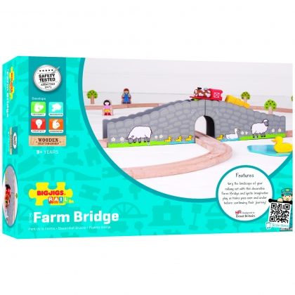 Младите любители на дървените влакчета могат да променят пейзажа на железопътния си комплект с този декоративен мост – ферма. Творческата игра е гарантирана, тъй като влаковете могат да преминат над и под моста. Повечето други големи марки дървени железопътни линии са съвместими с „Bigjigs Rail“. Играчката е изработена с безопасни материали. Боите са на водна основа. Играчката развива въображението на Вашето дете.