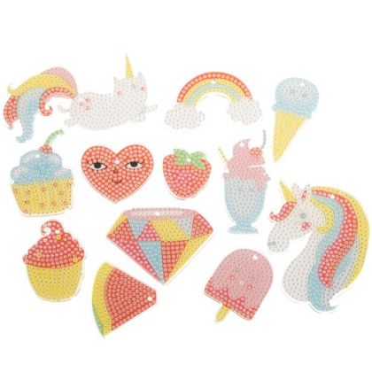 ✅ 12 красиви пластмасови шаблона – Включени в комплекта са 12 различни шаблона, включително сърце, ягода, ледени блокчета, кексчета, диамант, диня, дъга, еднорог, коте и чаша за лед. Тези разнообразни мотиви ще добавят уникален характер към вашите диамантени ключодържатели.