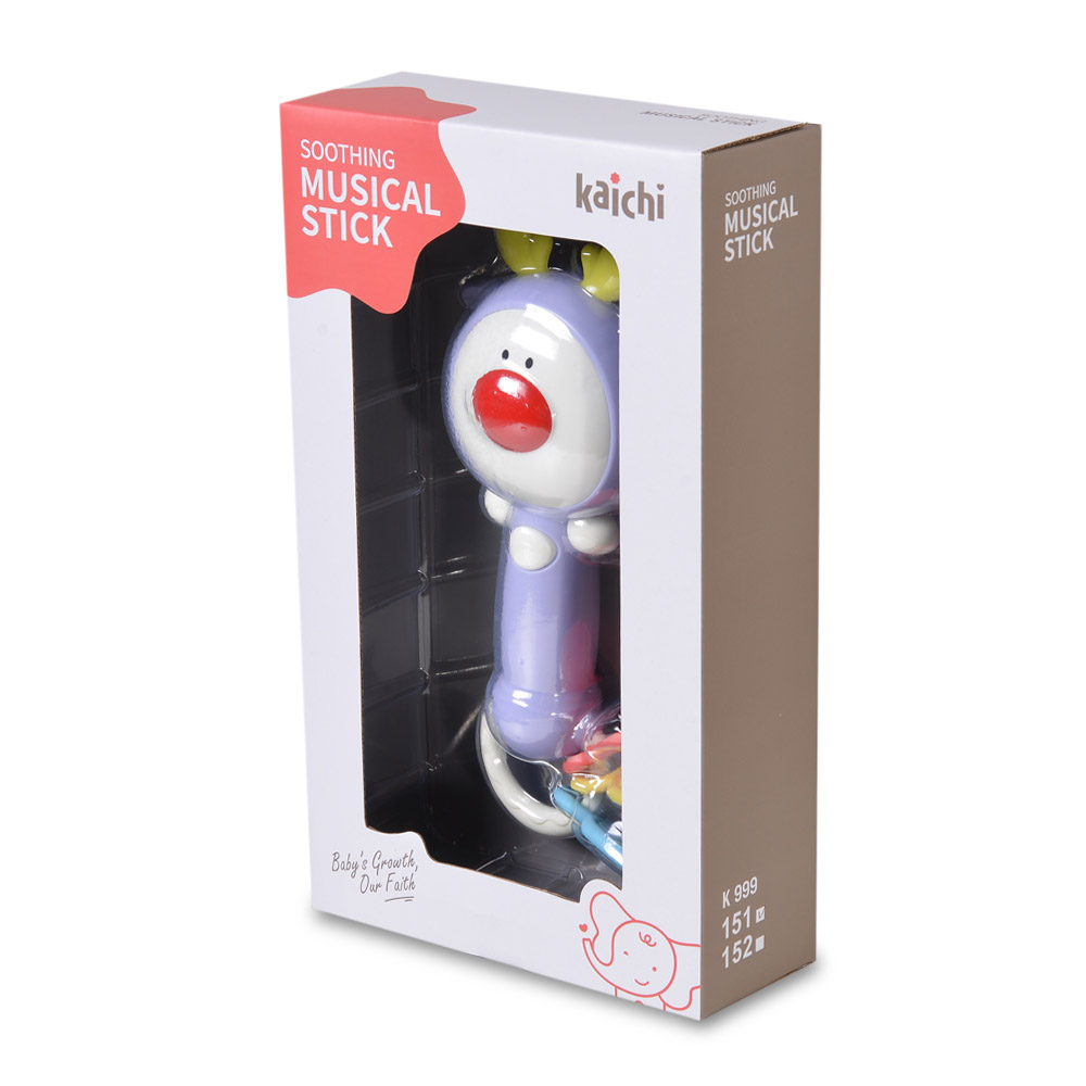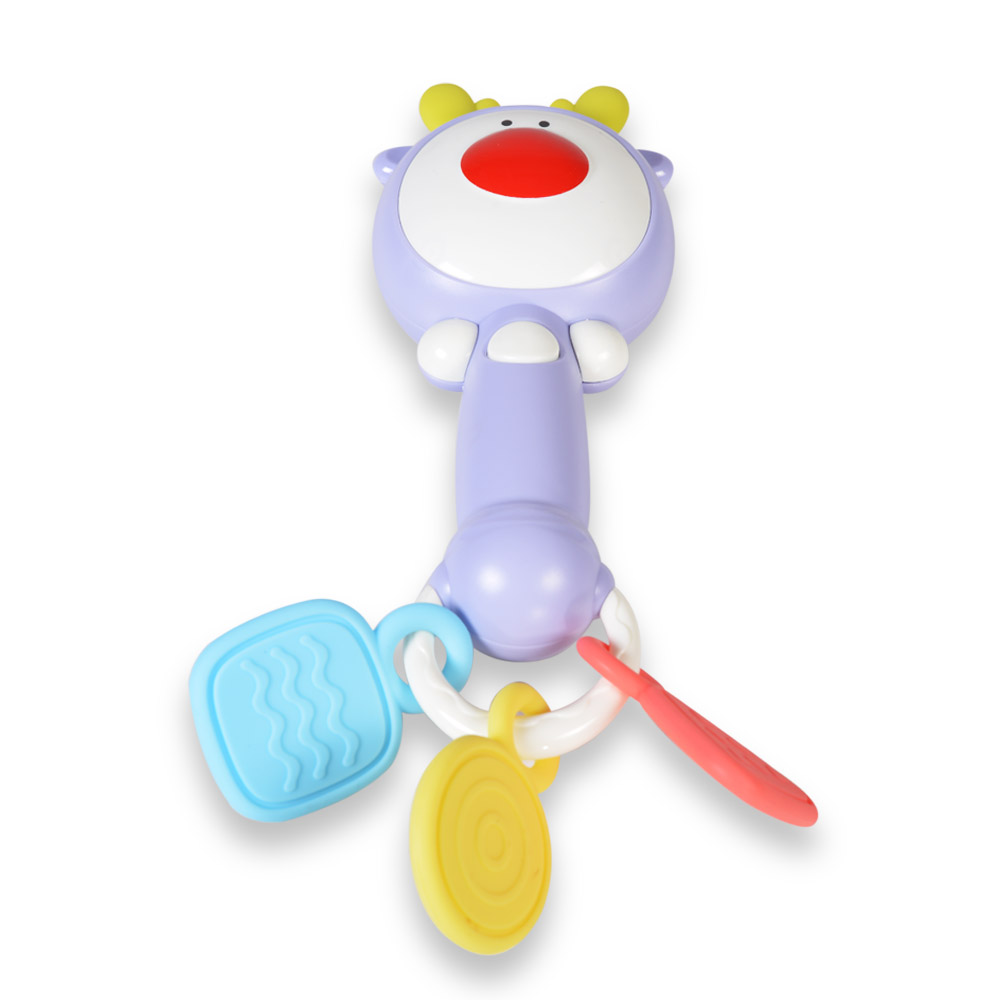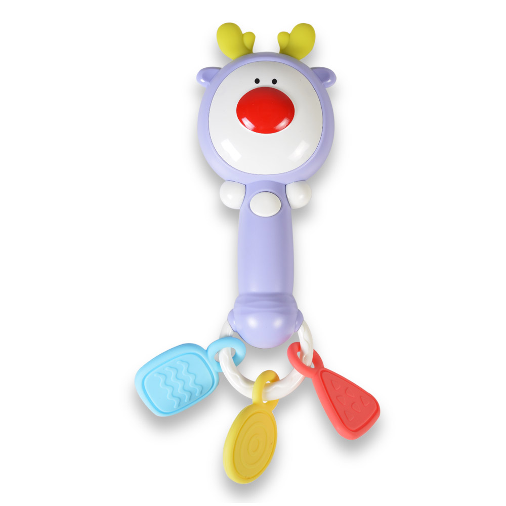 Музикалната дрънкалка с форма на еленче е забавна и стимулираща играчка, подходяща за бебета от най-ранна възраст. Тя съчетава ярки цветове, интересни текстури и нежна музика, която успокоява и привлича вниманието на детето. Удобната дръжка е съобразена с малките ръчички, а прикрепените цветни елементи насърчават развитието на фината моторика и сетивните умения. Изработена е от безопасни материали, подходящи за деца.