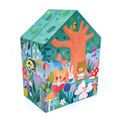 С форма на вълшебна дървена къщичка, тази музикална кутия впечатлява със своята необичайна архитектура, игриви илюстрации и светещи в тъмното елементи, които ѝ придават още по-магично усещане. Всяка страна на кутията е внимателно илюстрирана, за да пресъздаде света на гората и нейните обитатели, които оживяват с всяко завъртане на ключето.