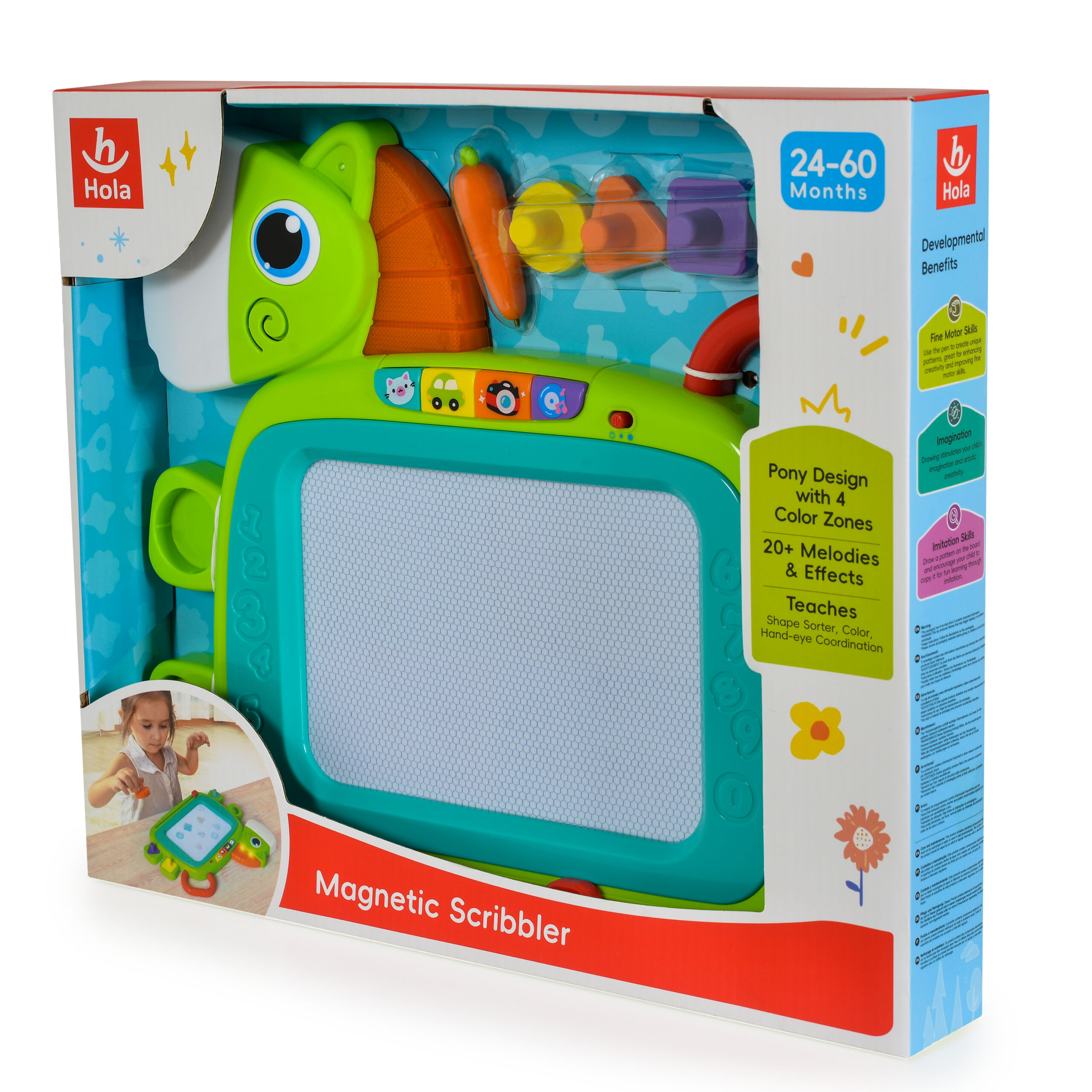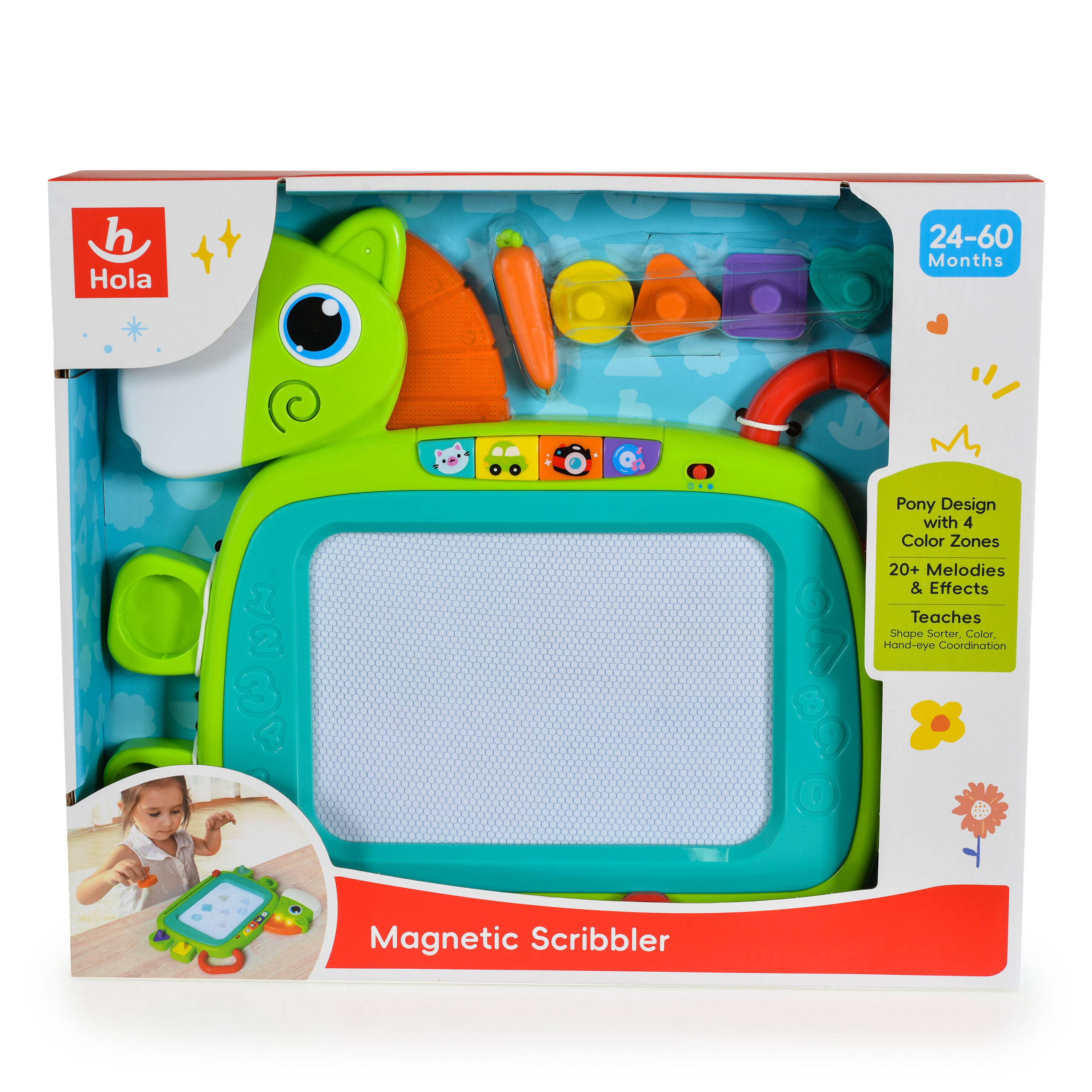 Тази цветна и интерактивна магнитна дъска позволява на децата да рисуват и творят, като едновременно се забавляват с музикални ефекти. С ярки цветове и лесни за хващане елементи, дъската стимулира въображението, фината моторика и координацията око-ръка. Подходяща за деца над 2 години.