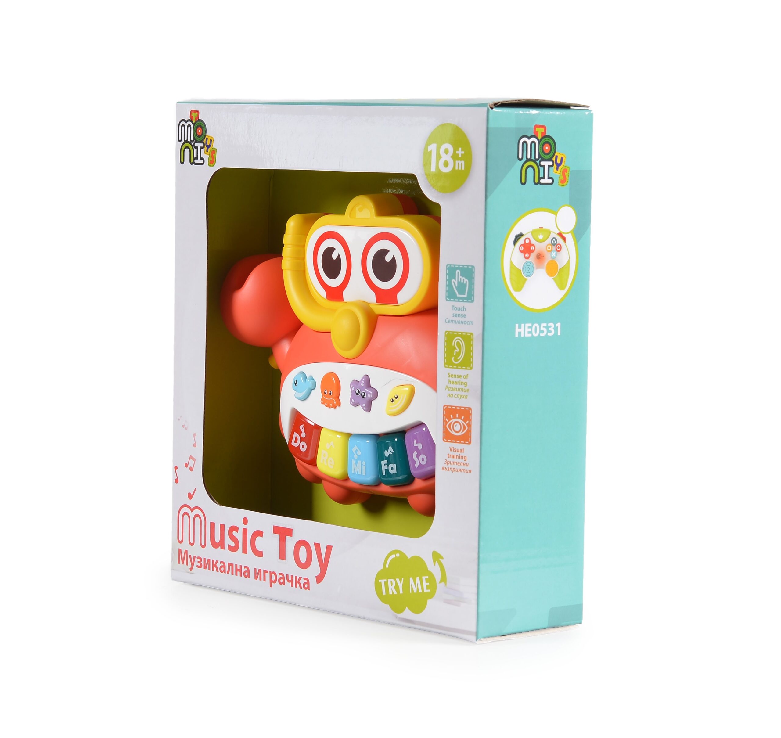 Moni Toys Музикално раче е ярка, музикална играчка, подходяща за малки изследователи на възраст над 18 месеца. То предлага весели музикални бутони, които помагат на детето да се запознае с различни звуци, форми и цветове, като стимулират слуховата и зрителната координация. Изработено от здрава пластмаса, играчката е подходяща за най-малките и лесна за почистване.