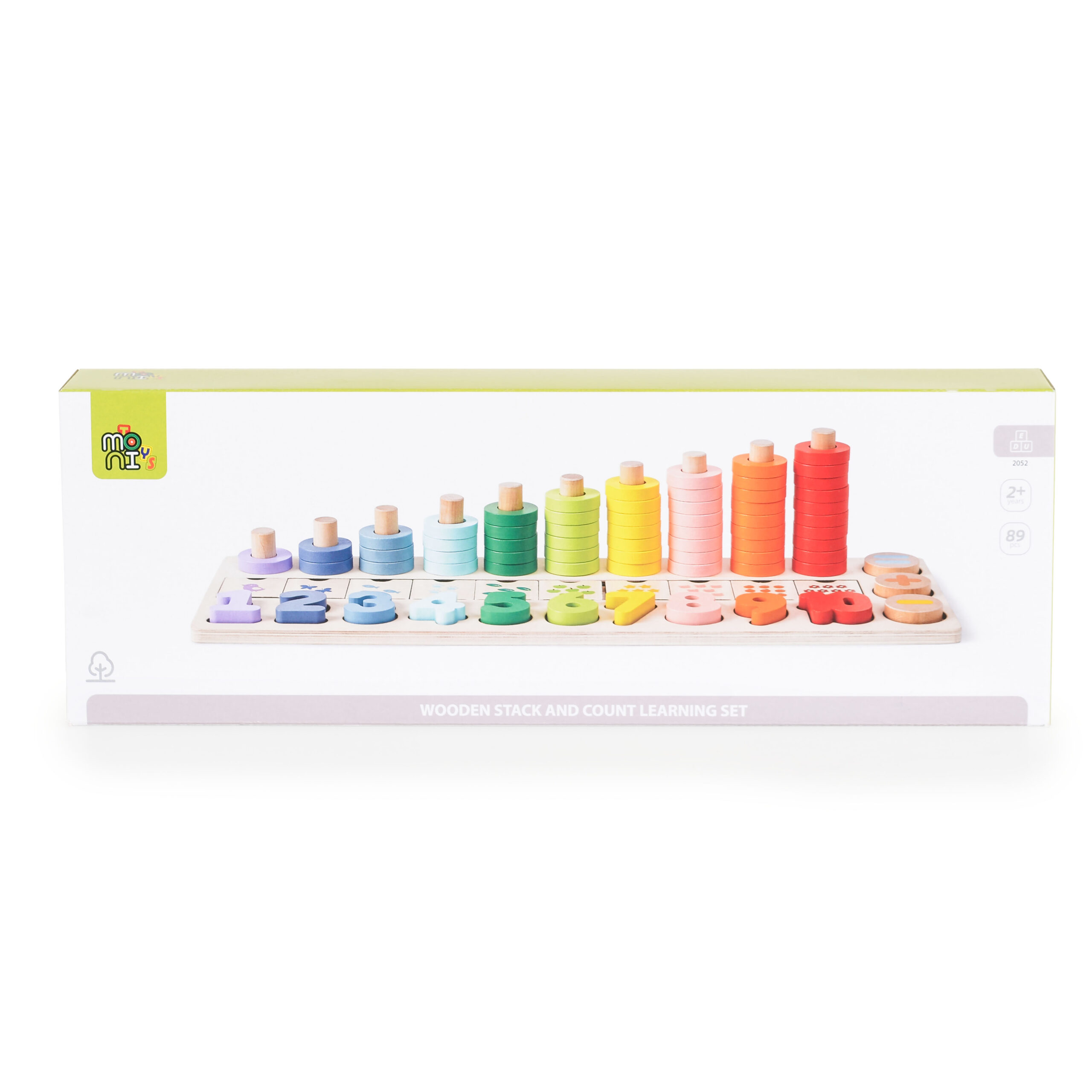 Дървеният комплект за броене от Moni Toys съдържа 89 елемента – цифри от 1 до 10, цветни шайби за нанизване, дървени пръчки, математически символи и карти със задачки. С него детето може да брои, съпоставя, реди и да прави първи стъпки в аритметиката по забавен и лесен начин.