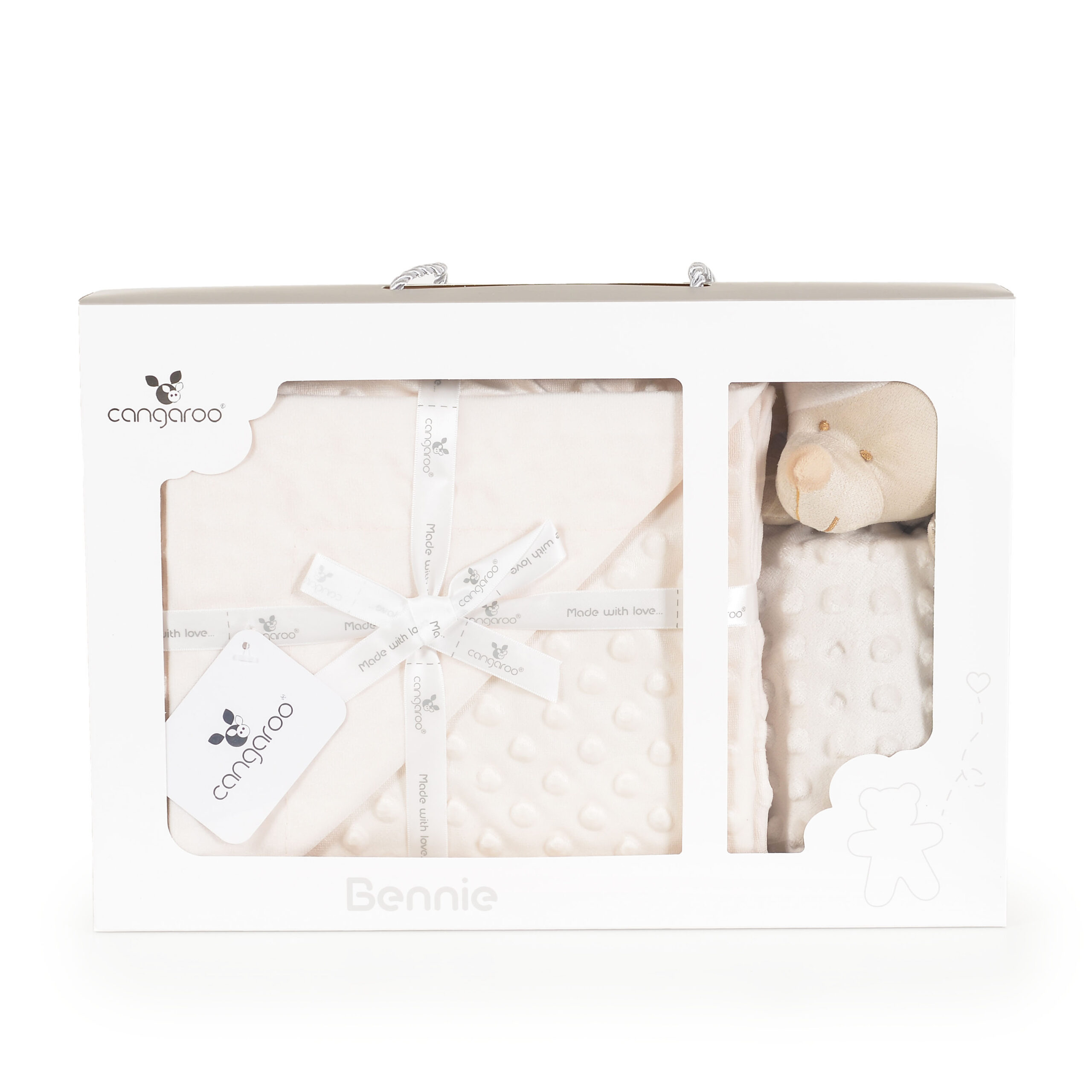 Одеялото и играчката са опаковани в стилна подаръчна кутия, идеална за подарък.