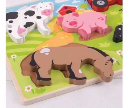 Мъничето Ви ще се запознае с любимите на всички животни от фермата – прасето, кравата, овцата и кончето, а около тях е и тракторът, който пренася сеното в обора. Животните са под формата на удобни за хващане фигурки, които трябва да бъдат поставени на картинката, съобразявайки се с формата на дупката, но с тях може да се играе и извън пъзела. След като бъде подреден пъзелът, детето може да покаже и звуците, които издават животинките. Той е изработен от дърво и е боядисан в много свежи цветове с нетоксични бои, напълно безвредни за мъниците.