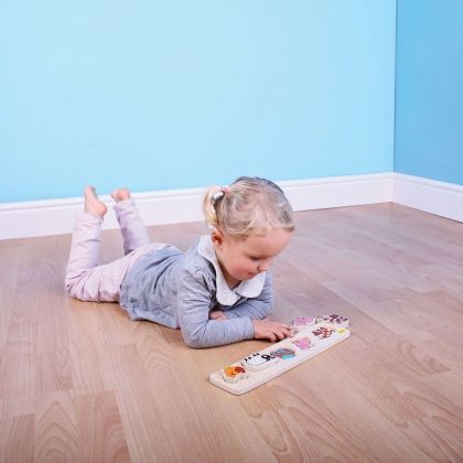 Частите на пъзела са с големина, удобна за хващане от малки ръчички. Всяко животно си има определено място и за по-голямо улеснение е изрисувано на основата за нареждане. Детето може да вдигне фигурката, да я разгледа и да я върне обратно в пъзела. Заниманията с пъзела стимулират фината моторика, концентрацията и речевите способности.