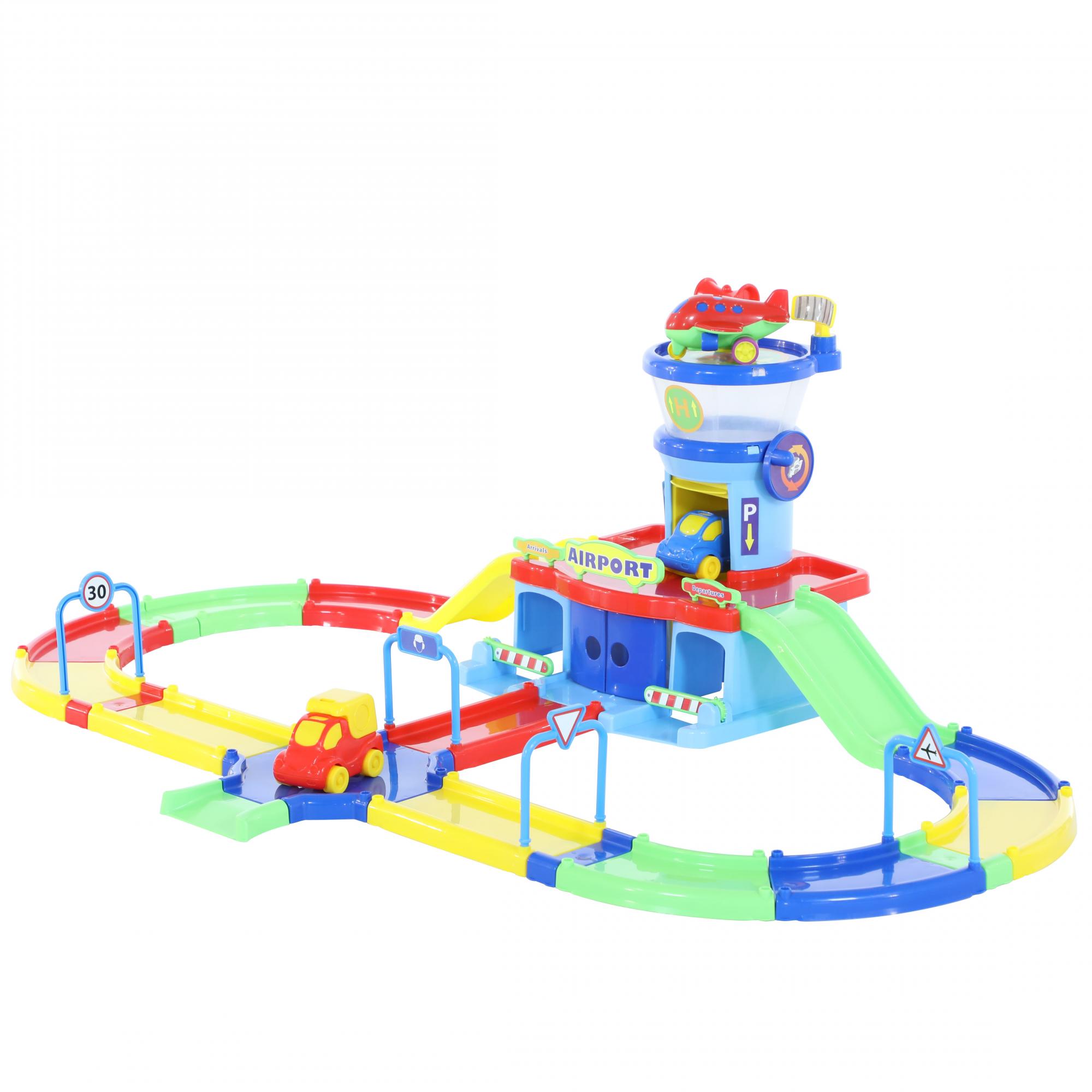 Тази детска играчка ще отведе малките пилоти и авиатори на вълнуващи пътешествия, без да напускат стаята. Комплектът включва цветно изработени елементи от безопасна пластмаса – контролна кула с асансьор, два автомобила, самолет и пътни знаци. Различните варианти за подреждане на пистата развиват въображението и творческото мислене.