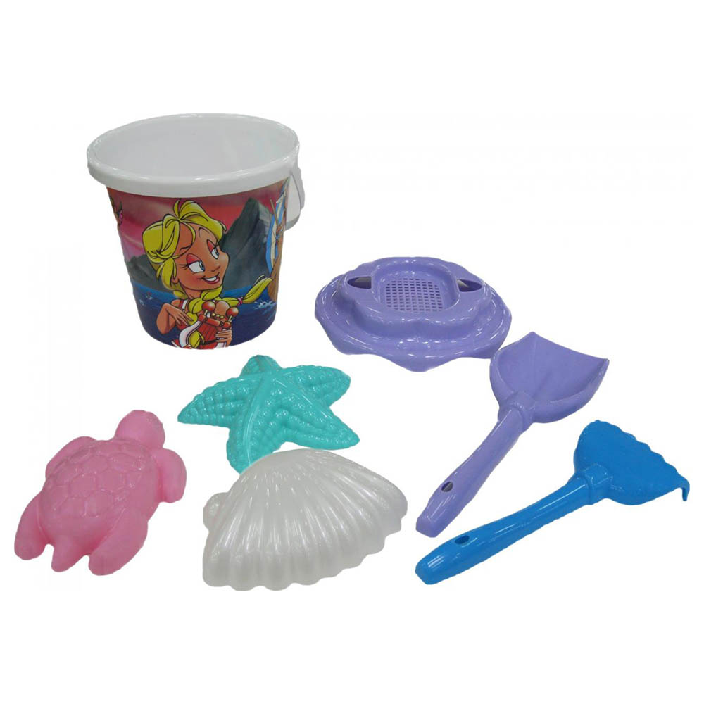 Комплектът съдържа: 1 бр. декорирана плажна кофичка, 1 бр. сито, 1 бр. лопатка, 1 бр. гребло, 3 бр. пясъчни формички (мида, костенурка, морска звезда).