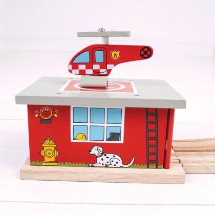 Ако търсите място за влакчето далеч от огъня, добавете към комплекта си дървената пожарна станция на Bigjigs Rail. В този специален дървен навес има място за спиране на два локомотива. В комплекта е включен хеликоптер за пожарна безопасност и площадка за кацането му. Повечето други големи марки дървени железопътни линии са съвместими с „Bigjigs Rail“.Играчката е изработена с безопасни материали. Боите са на водна основа. Играчката насърчава въображението, сръчността и координацията.