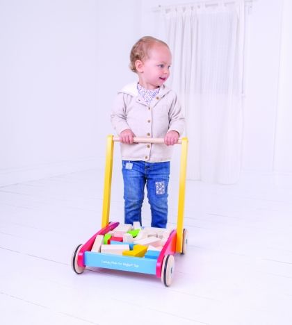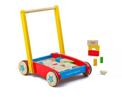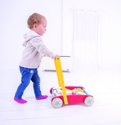 Забавна, образователна и креативна, тази класическа дървена бебешка проходилка се отличава със здрава дървена рамка и лесна за хващане дръжка. С нея уверените стъпки на детето Ви бързо ще се превърнат в негова втора природа. Когато то се измори от разходка, е време за игра с цветните фигурки, които са в различни форми, размери и цветове, и могат да бъдат прекарвани навсякъде с количката. Изработката е от безопасни и висококачествени материали. Изисква се монтаж от възрастен.