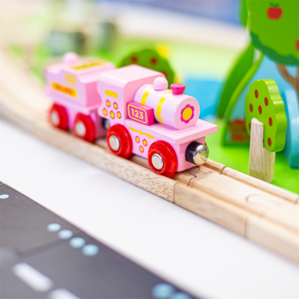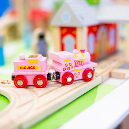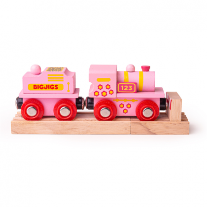 Този Розов 123 Локомотив е направен специално за любителите на прекрасните розови цветове. Магнитните съединители осигуряват съвместимост с всички други локомотиви и вагони в гамата Bigjigs Rail. Повечето други големи дървени марки на железопътния транспорт са съвместими с „Bigjigs Rail“. Играчката е изработена с безопасни материали. Боите са на водна основа. Играчката развива въображението и твоческото мислене на Вашето дете.