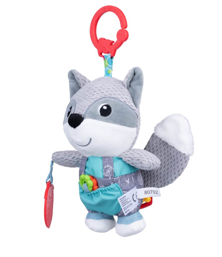 Лисицата е изработена от материали с разнообразна текстура, ушите и опашката й шумолят, а на корема има джоб, в който можете да скриете пришити за нея цветни гризалки.
