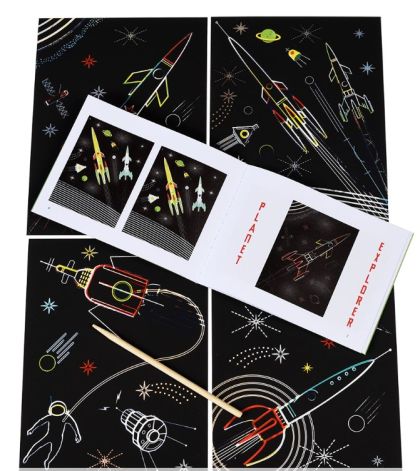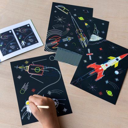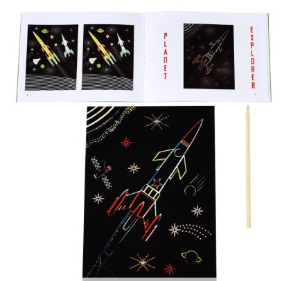 Комплектът съдържа 4 бр. скреч карти с метален блясък, дървена скреч пръчка, с която детето ви да твори върху магическите картини и книжка с инструкции. Накарайте изображенията да оживеят и вижте колко ракети, звезди и планети крият картините. Вълнуващо приключение, което подобрява фината моторика, развива креативността и насърчава творческия потенциал в мъниците.