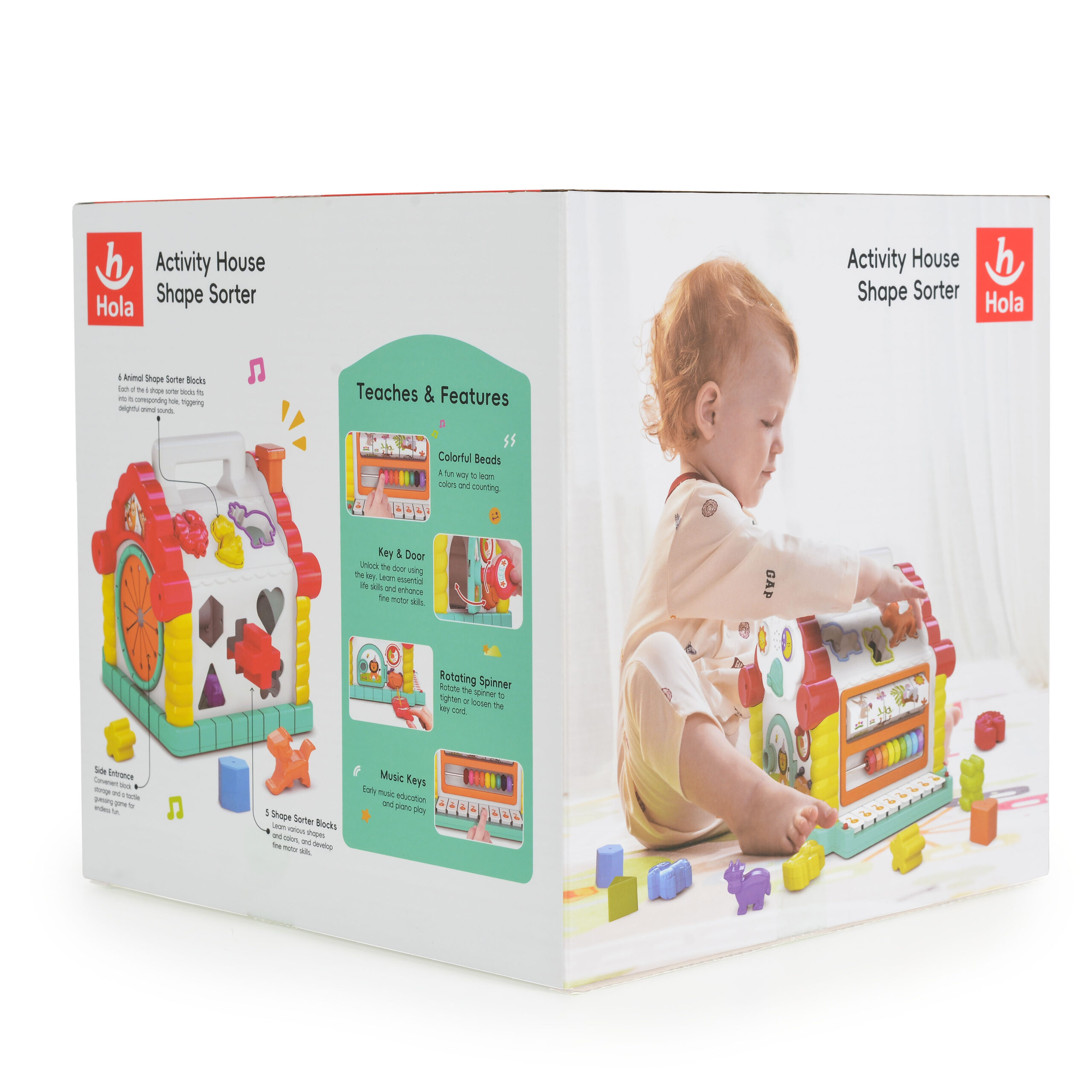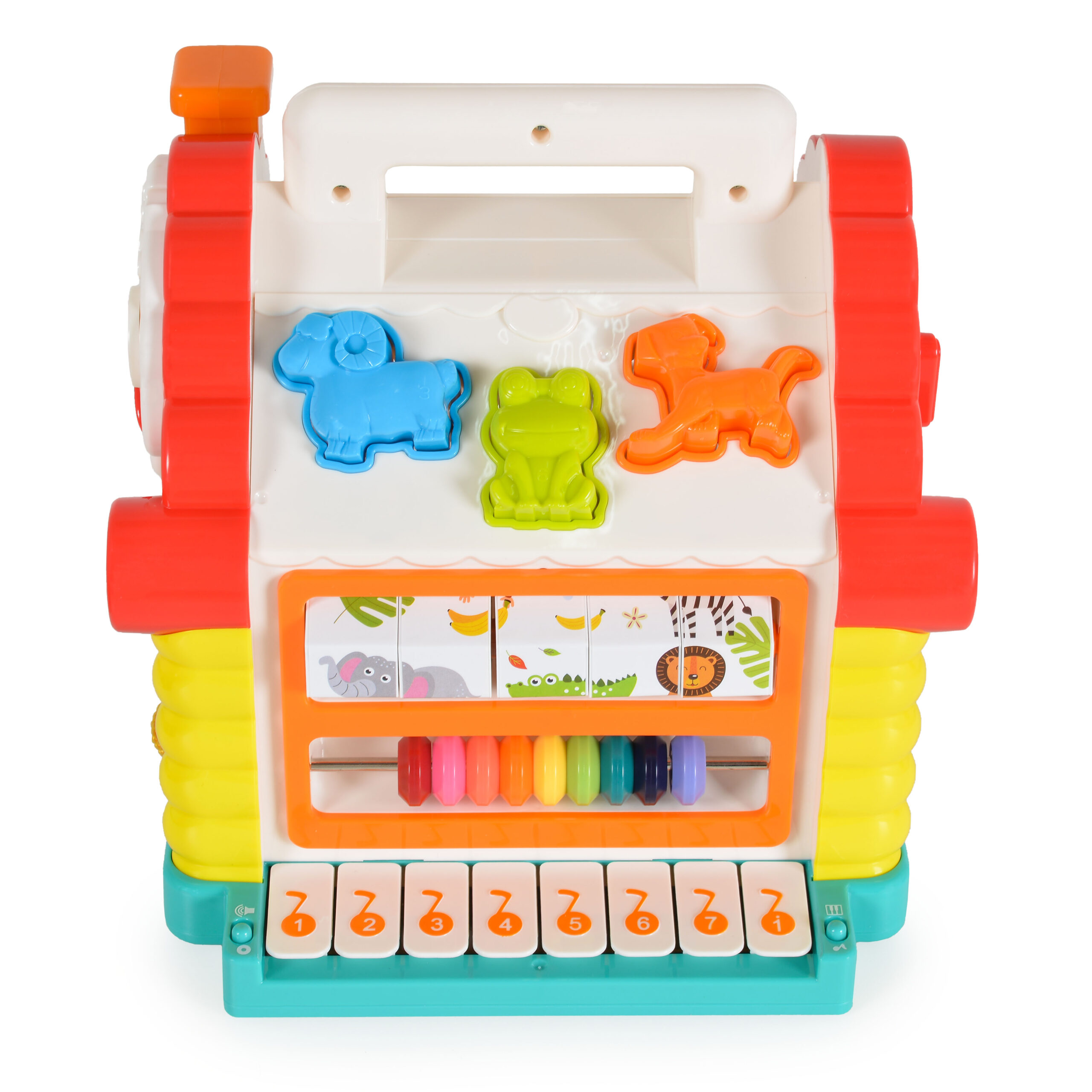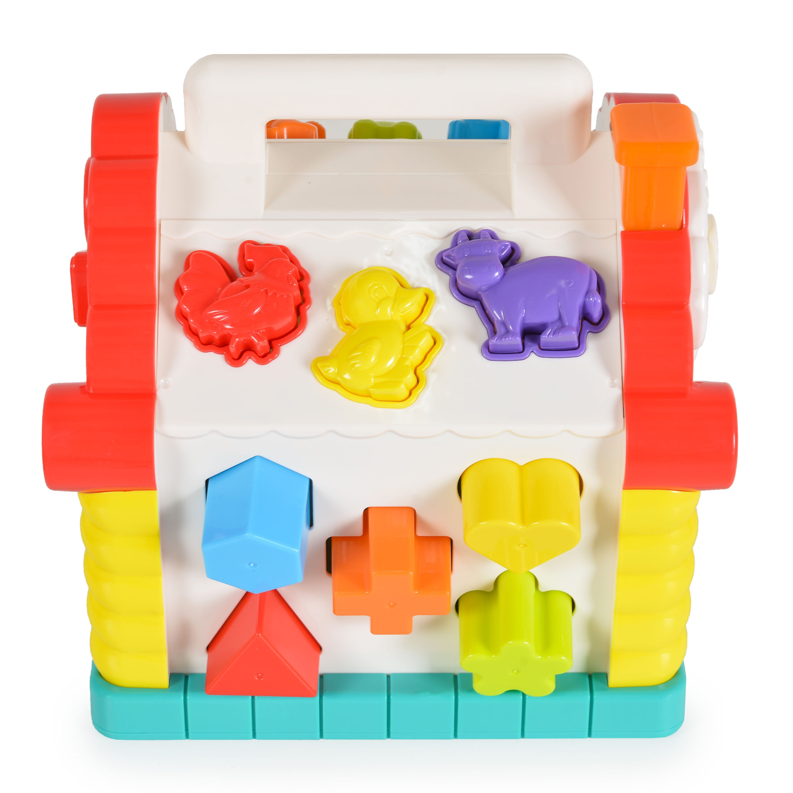 Този сортер за игра предлага богат набор от активности, които съчетават забавление и обучение. С нея децата могат да откриват звуци на животни, да научават цветове, геометрични форми и основи на броенето.