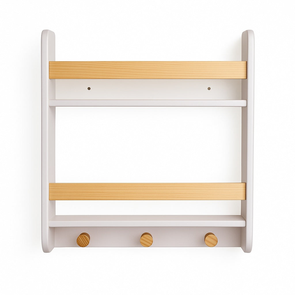 🔹 Функционален дизайн: Разполага с два рафта за книги и играчки, както и три дървени закачалки, подходящи за дрехи, чанти или други аксесоари.