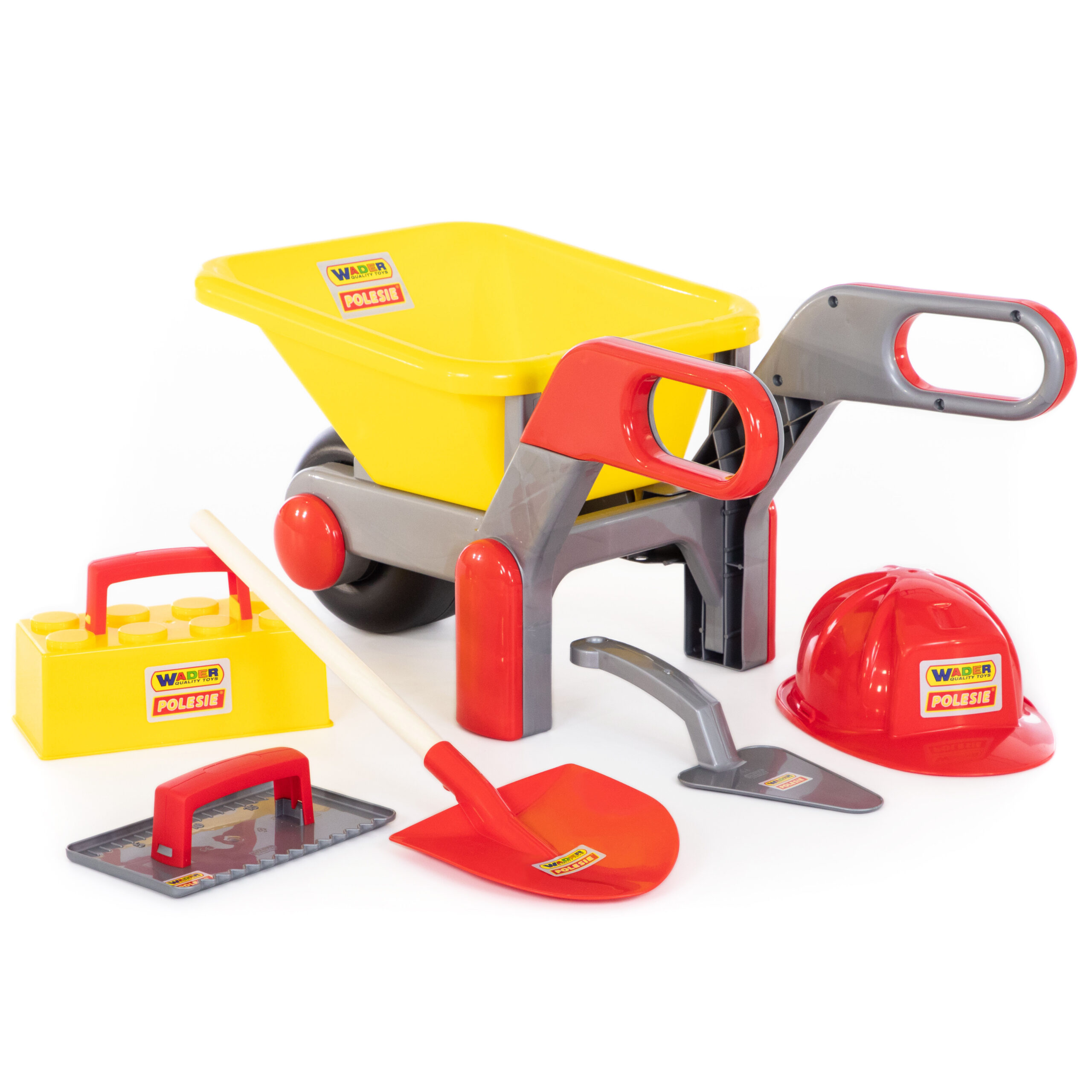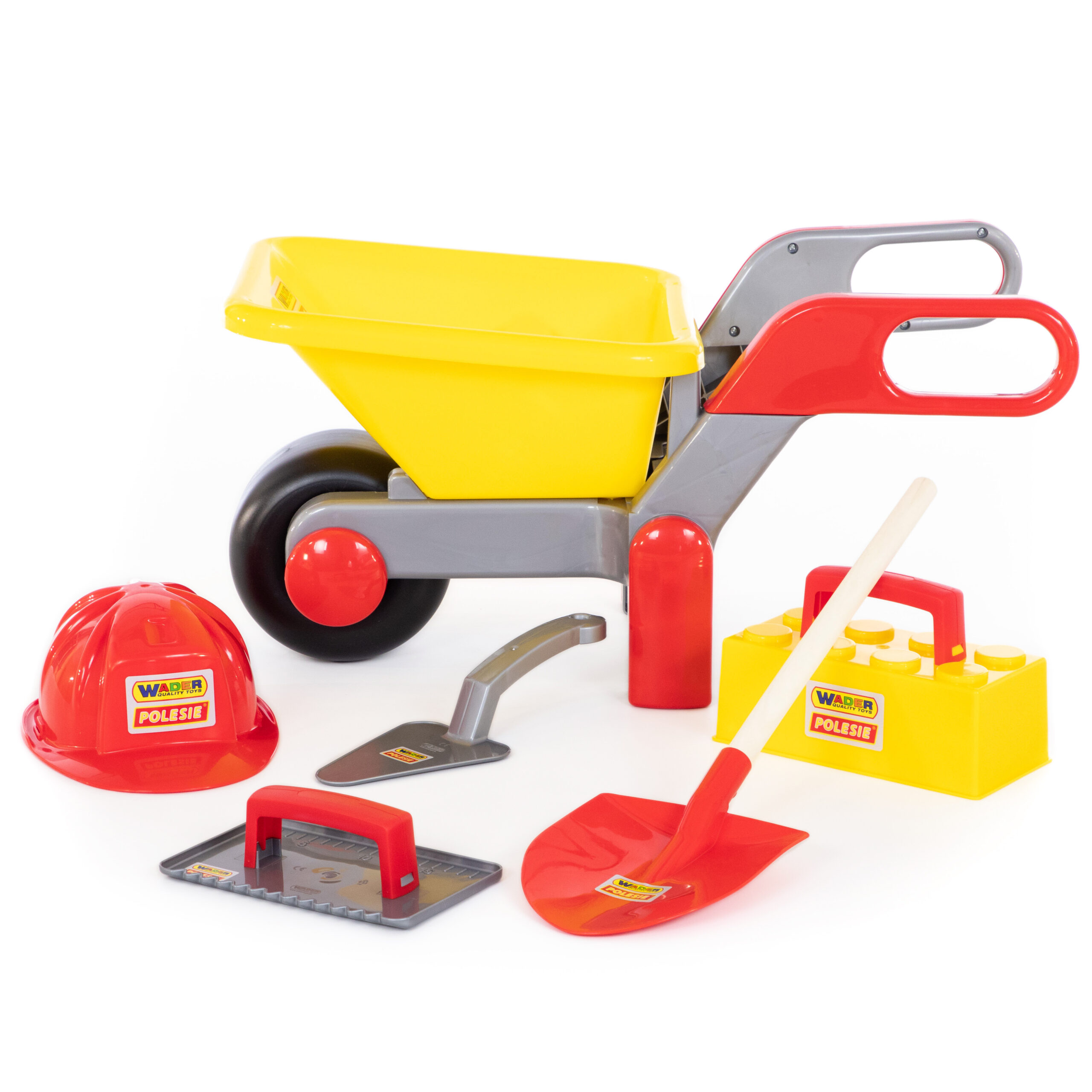 Комплектът съдържа: количка; защитна каска; лопата с дървена дръжка; мистрия; лопатка; тухлена форма с дръжка.