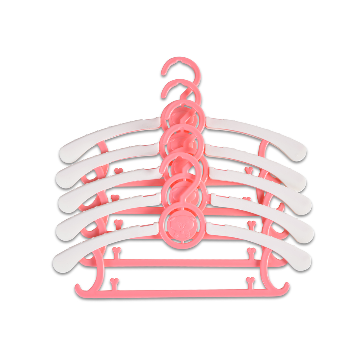 Телескопичните закачалки за дрехи са изключително практични и необходим атрибут за винаги спретнат и подреден гардероб на всяко дете. Регулиращата се дължина на раменете (от 28.5 до 38 см.) осигурява ползване за дълъг период от време и пасва на всеки размер дрехи във всеки етап на растеж на детето (от 0 до 18г.). Противоплъзгащи рамене с назъбени помагат за предотвратяване на подхлъзване на дрехите. Многофункционален дизайн – подходящ за потници, тениски, панталони, рокли, хавлии, поли и др. Комплектът включва 5 закачалки.