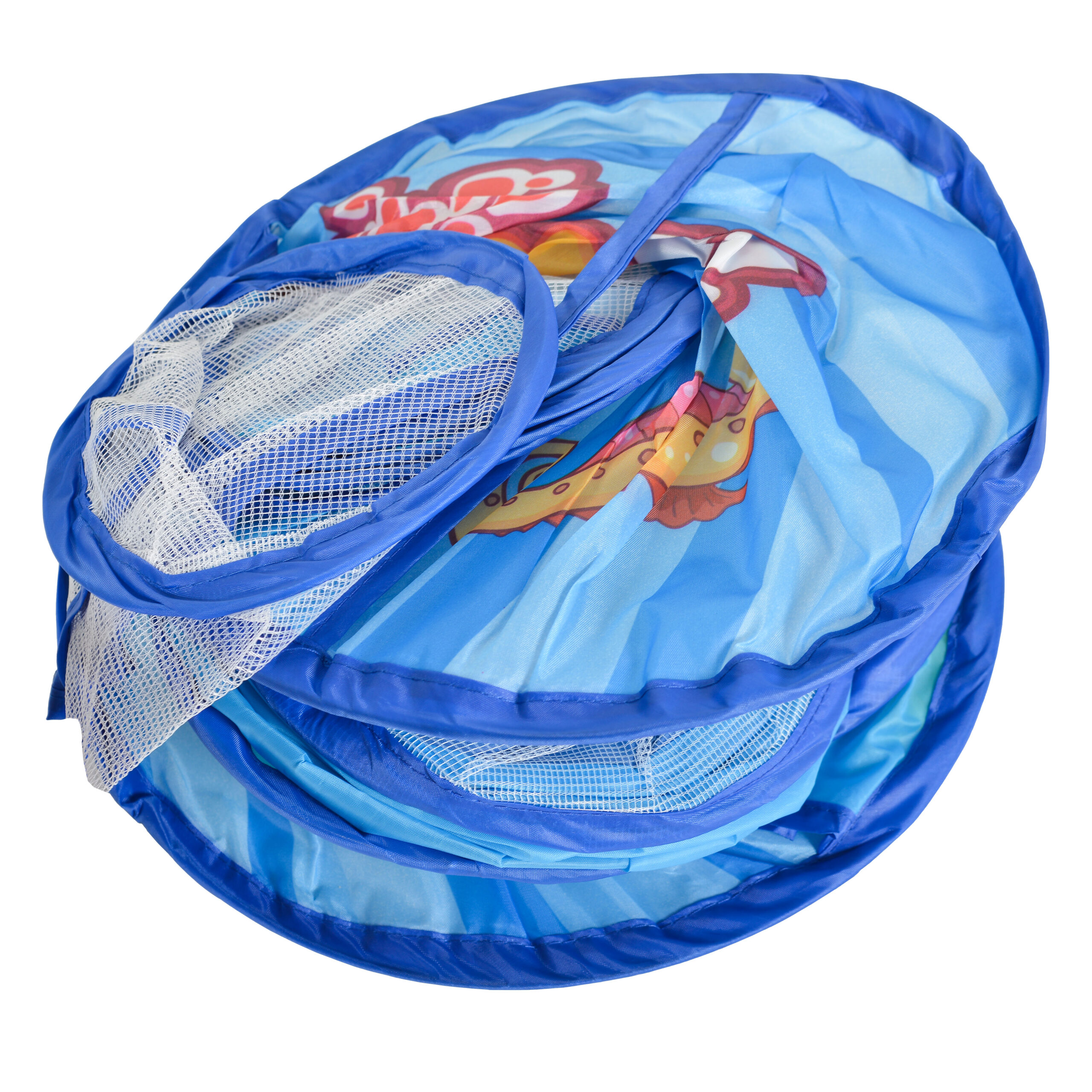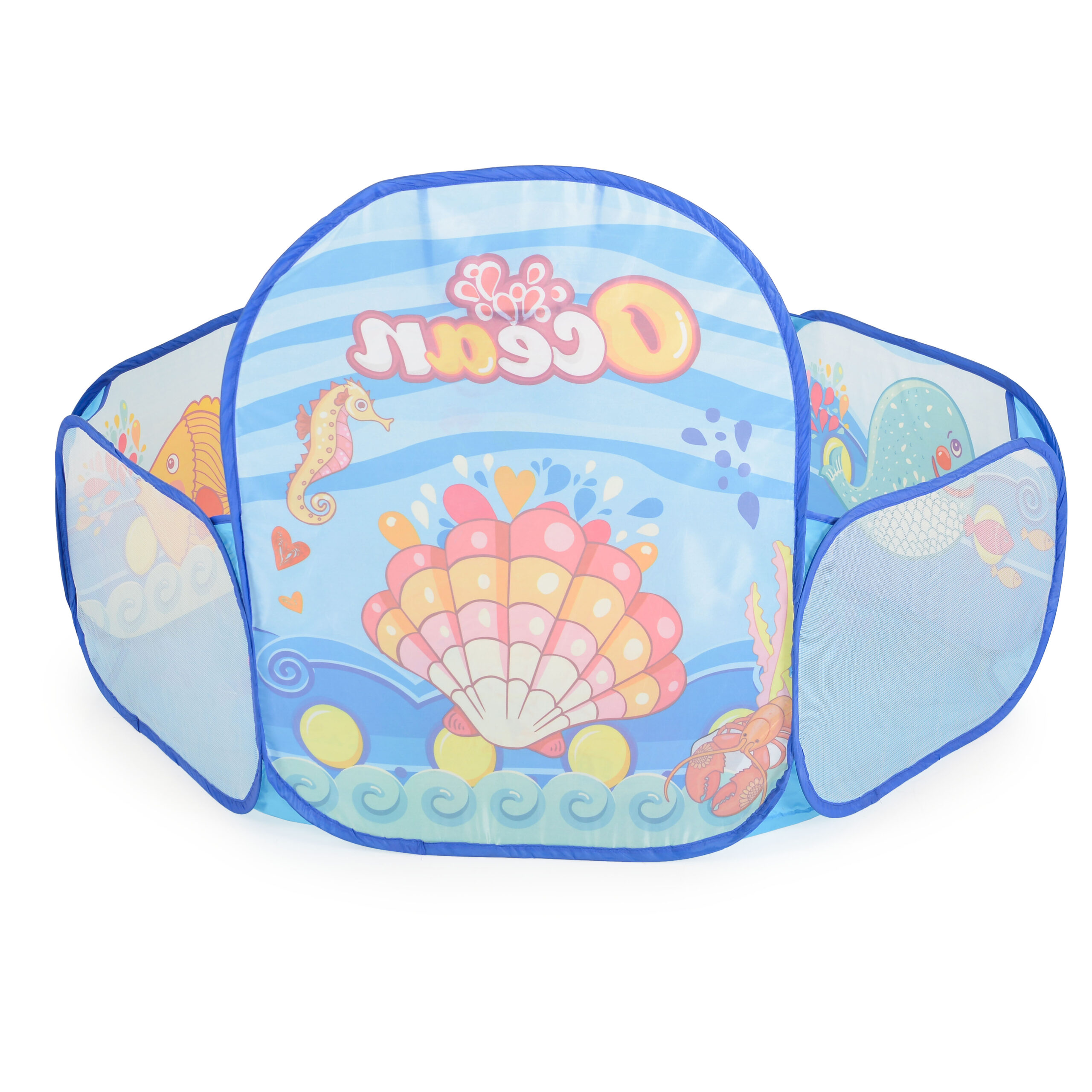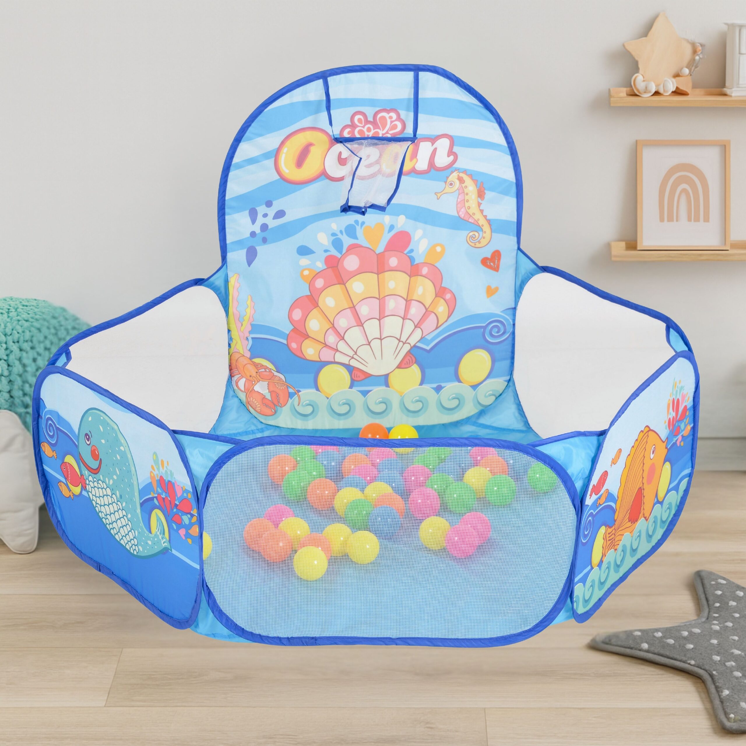 Осигурете на детето си часове забавление с този сгъваем басейн с морски мотиви, 50 цветни топки и баскетболен кош!