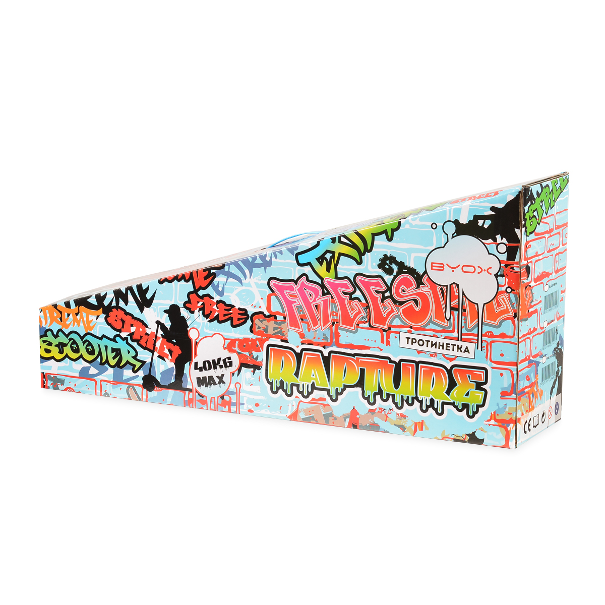 Алуминиевата тротинетка Rapture от Byox комбинира стабилност, стил и забавление, благодарение на своята здрава конструкция и атрактивен водно-трансферен принт върху PP платформата. Тя е подходяща за ежедневна употреба и осигурява безопасно каране за деца.