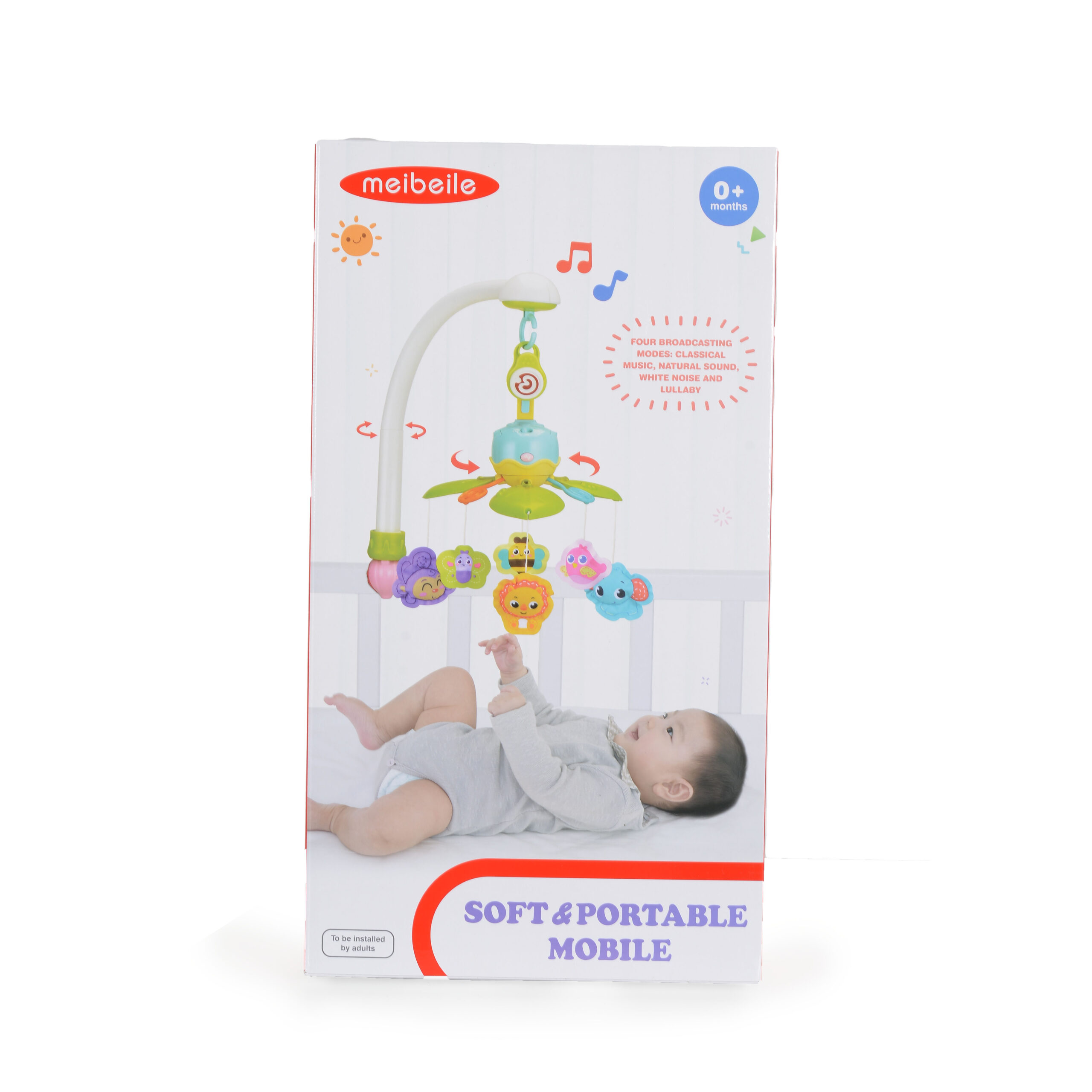 Не позволявайте детето да дърпа играчките. Чрез този продукт се стимулират слуховите и зрителните възприятия на детето, а също се допринася за по-лесното му приспиване и спокоен сън. Музикалният механизъм е с бутон ON/ OFF и бутон за смяна на мелодиите.