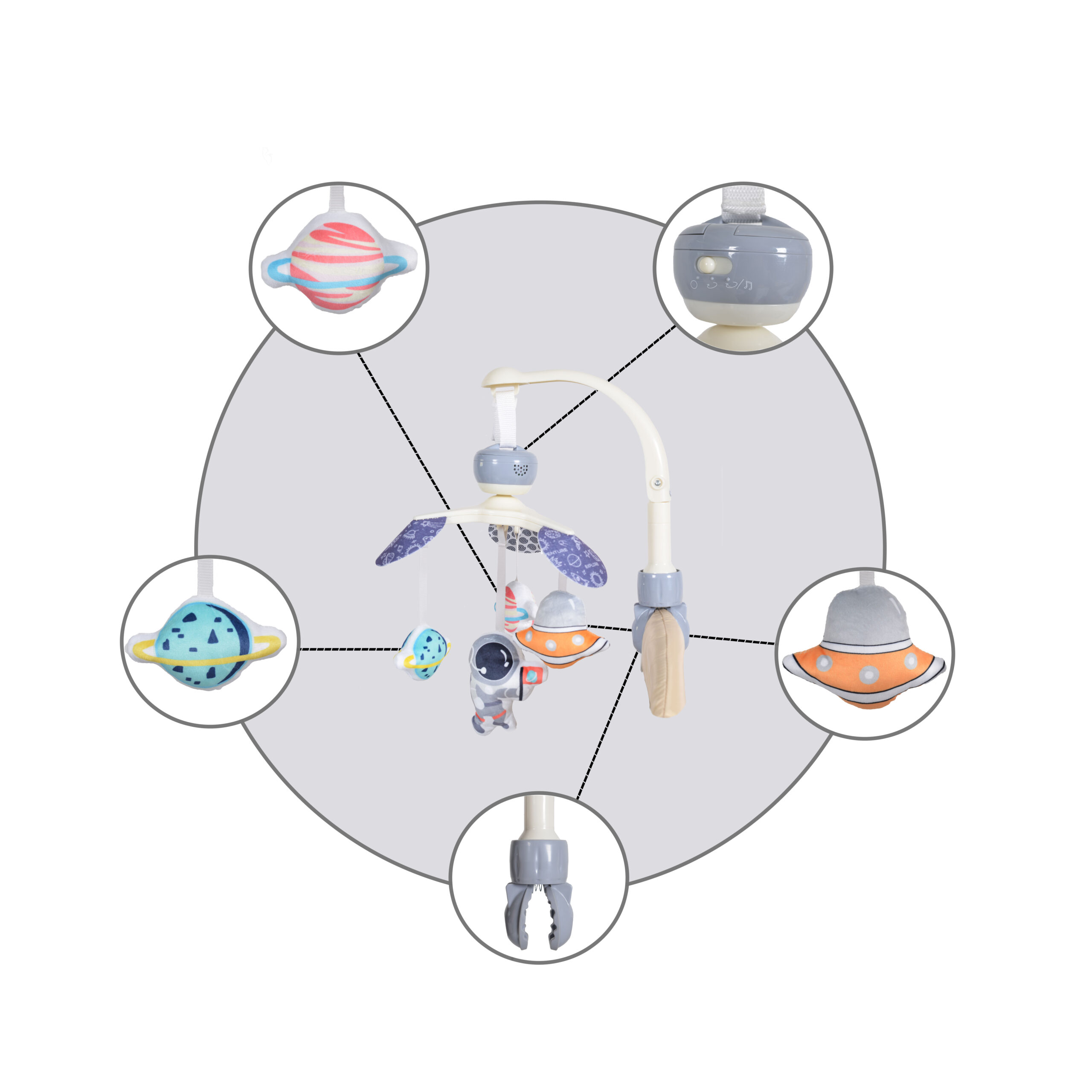 Чрез този продукт се стимулират слуховите и зрителните възприятия на детето, а също се допринася за по-лесното му приспиване и спокоен сън.