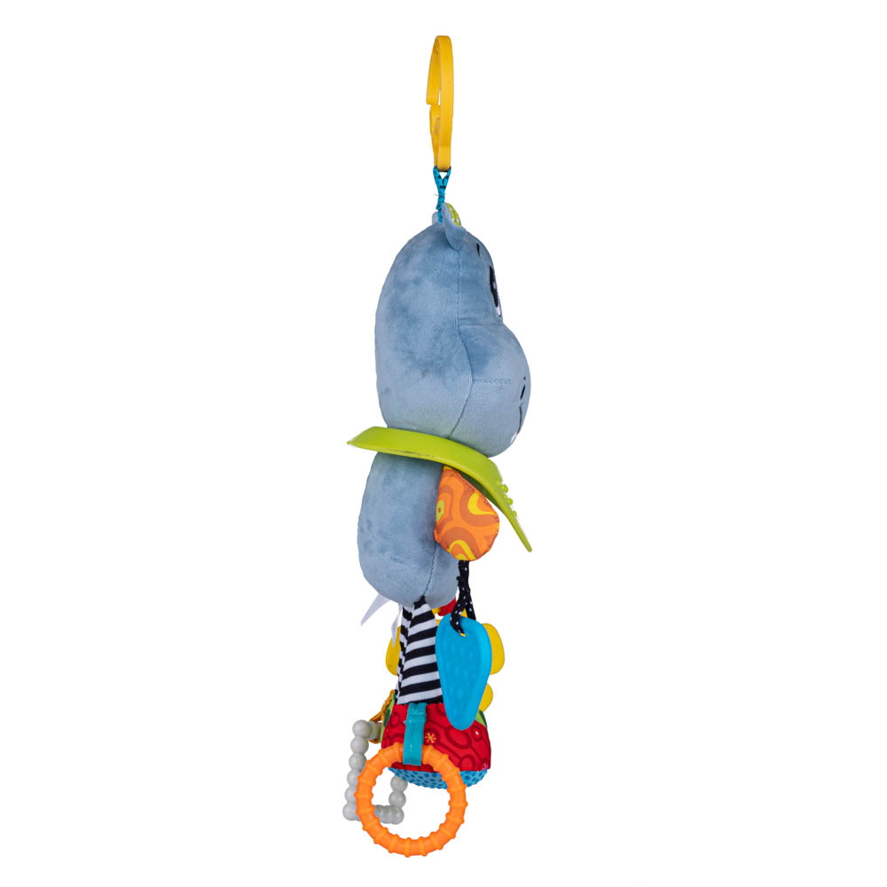 Камбанка, скрита в корема на хипопотама, издава весел звук, когато играчката се разклати.