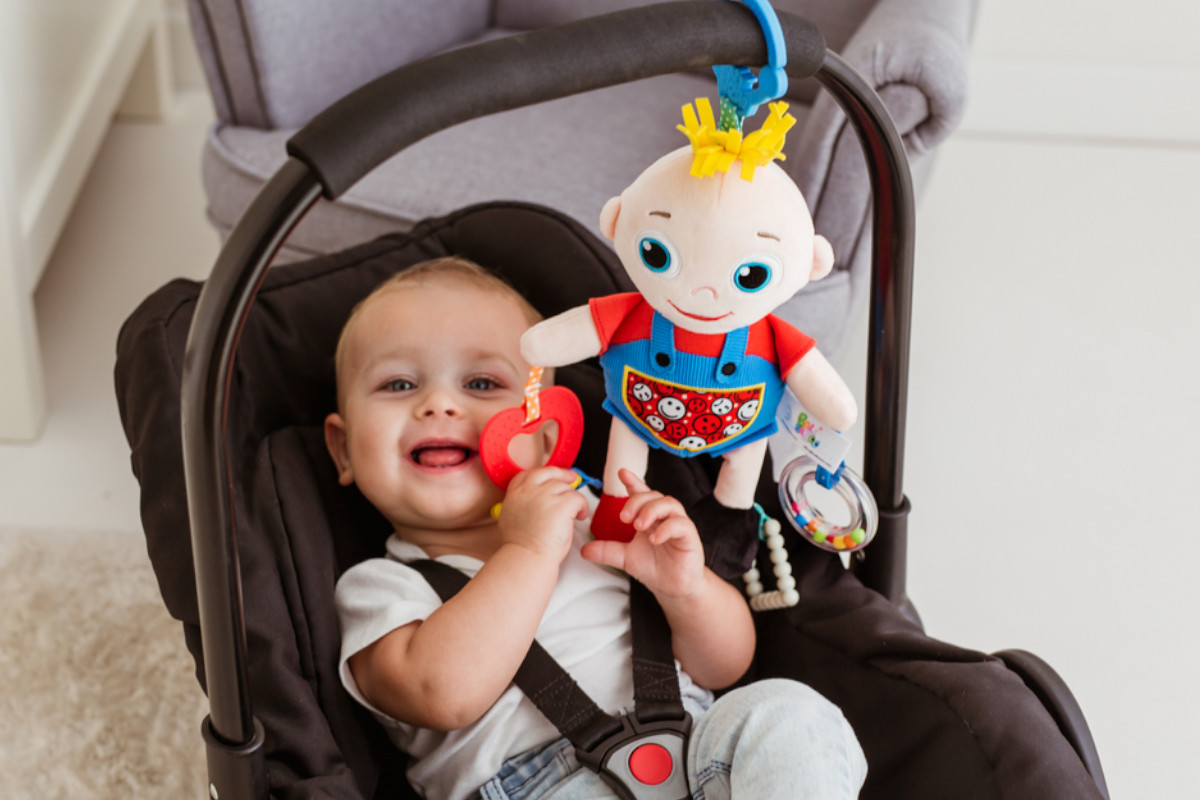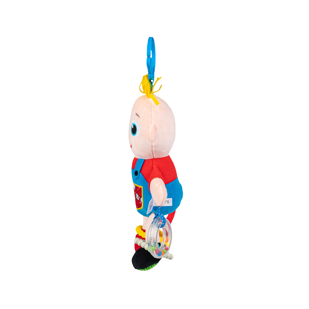 Бебе за бебе! Весела кукла от плат във формата на момченце е висулка, която може да придружава детето навсякъде, както на разходка, така и у дома. Играчката крие много изненади. Декорирана е с гризалки и дрънкалка, а материалът, от който е изработена, е с различни текстури, които ще стимулират усещането за допир на детето. Практична висулка ви позволява да прикрепите куклата навсякъде. Продуктът е предназначен за деца от раждането.
