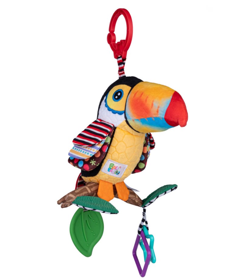 Туканът има прикрепена гризалка, а в корема му е скрито звънче, благодарение на което играчката издава весел звук при разклащане.