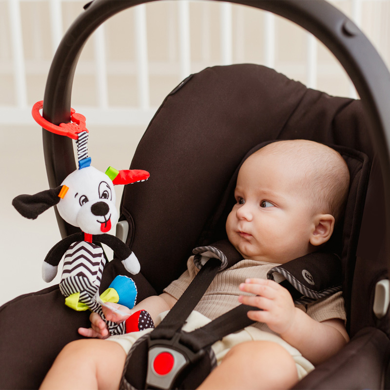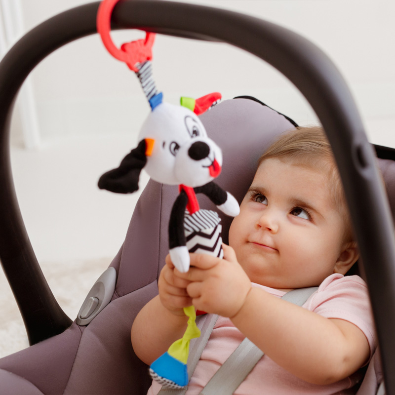 Меко и цветно плюшено кученце с музикален механизъм, който възпроизвежда нежна мелодия при завъртане. С халка за лесно прикрепване към количка, креватче или столче за хранене, тази висулка е идеален спътник за новородени и малки деца. Подходяща за деца от 0 месеца нагоре.