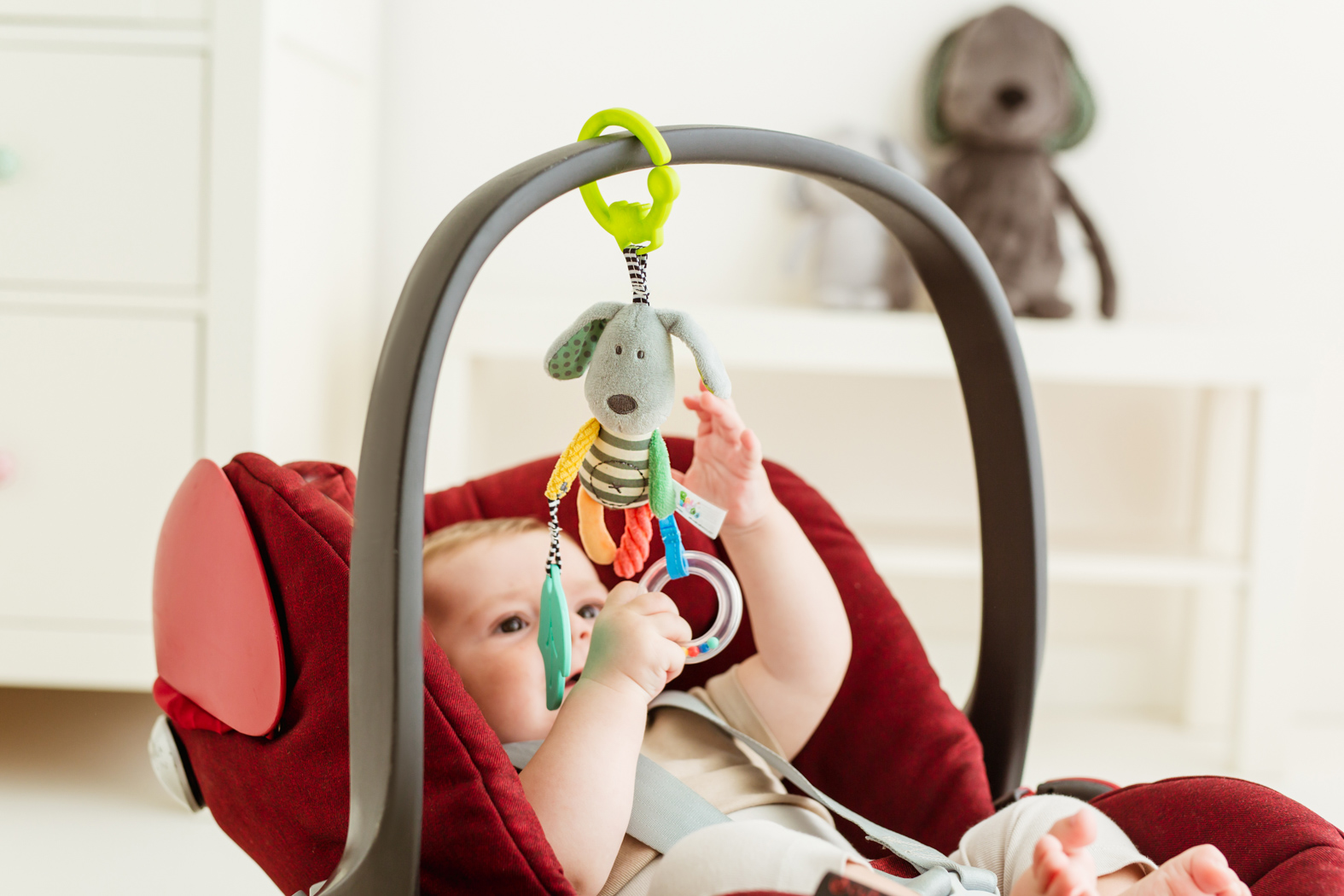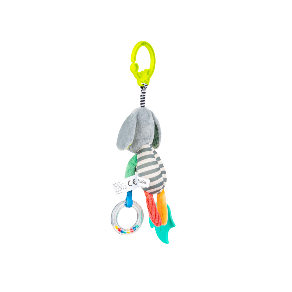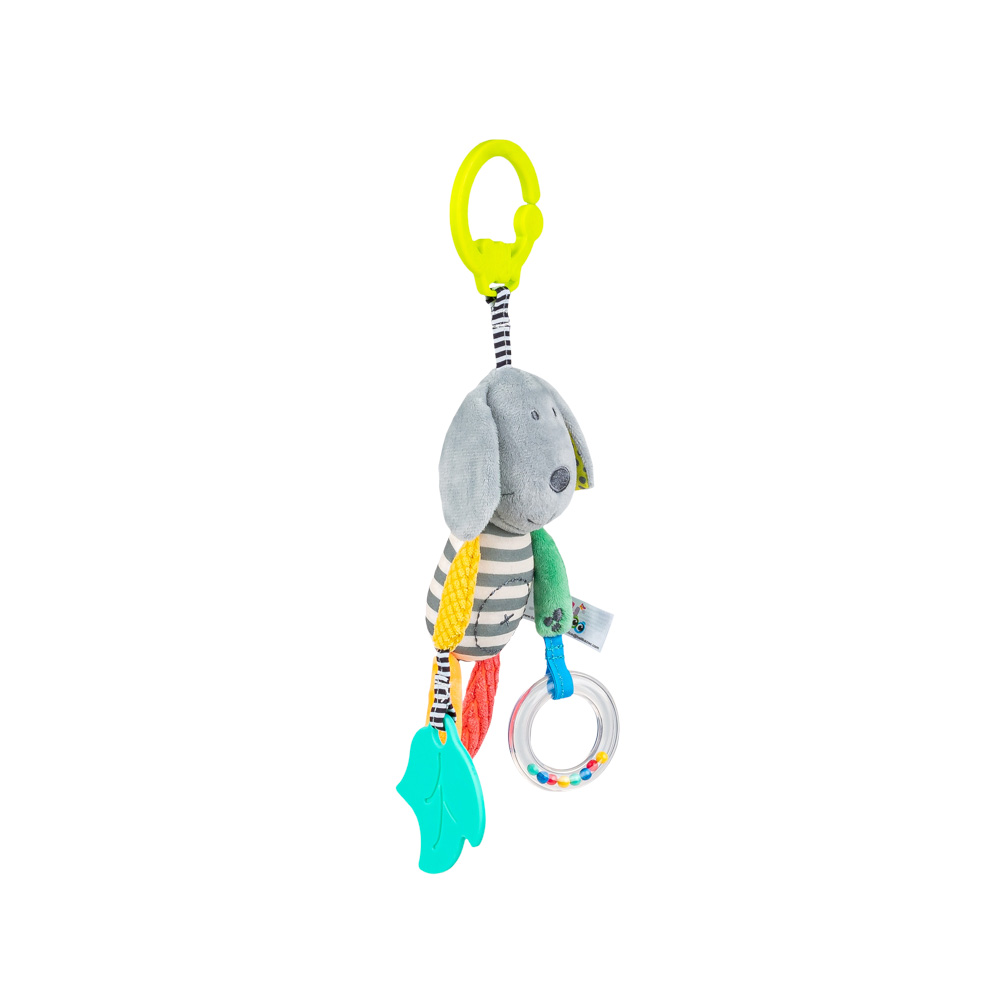 Компактна висулка във формата на куче може да придружава бебето навсякъде, украсявайки столче за кола, количка или легло. Очарователното куче е изработено от материали с разнообразни шарки и текстури, благодарение на които стимулира сетивата на малкото дете, като влияе положително върху развитието на когнитивните му способности. Лапите на кучето са украсени с мека гризалка, която ще успокои възпалените венци и дрънкащ пръстен, пълен с цветни топки. Практичната дръжка, с която е оборудвана играчката, позволява лесното й закрепване навсякъде. Продуктът е предназначен за деца от раждането.