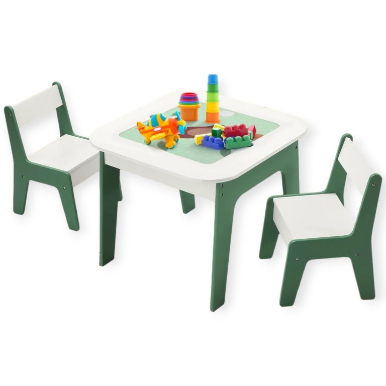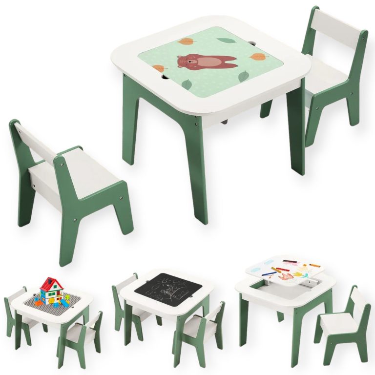 Детска Масичка със Столчета 4 в 1 GINGER HOME, 2 Плота, Черна дъска и Плот за Редене на Конструктори тип LEGO, Forest
